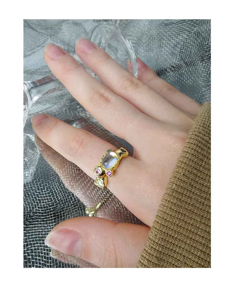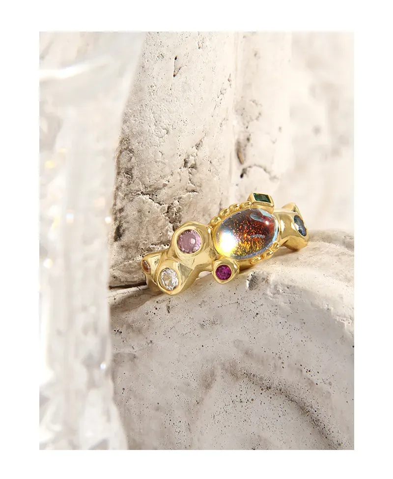 • Patterns & Textures: The smooth, polished gold surface provides a luxurious base, subtly accented by a delicate beaded texture framing the central opal. The surrounding multi-colored gemstones are set with an artful, irregular placement, reminiscent of scattered stardust or dew drops, embodying the imperfect beauty and raw textures cherished by Malisse.
