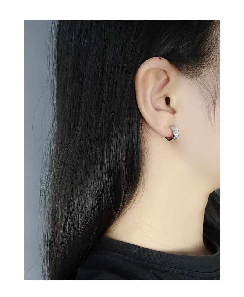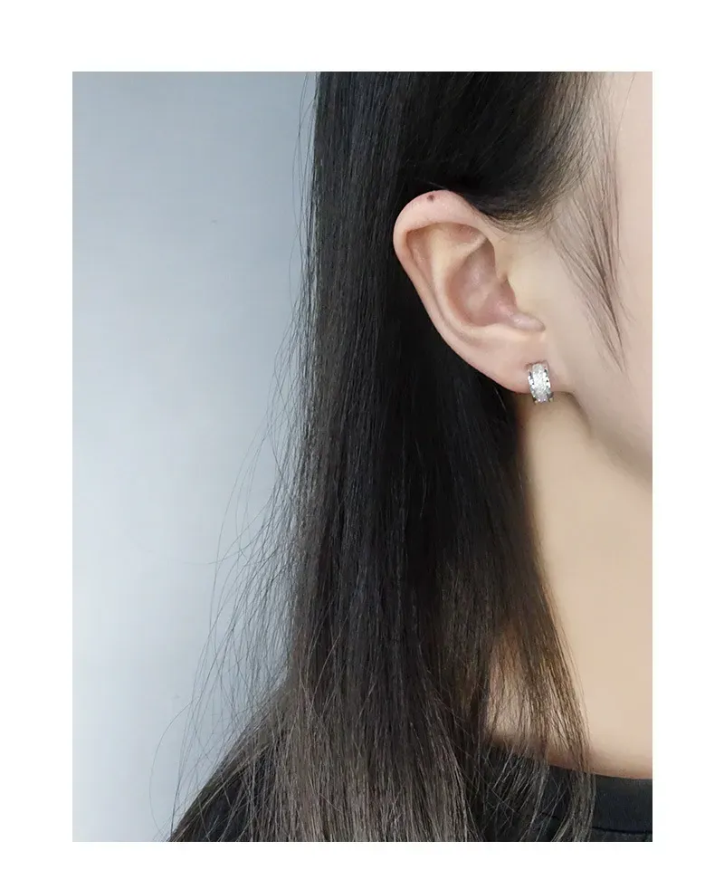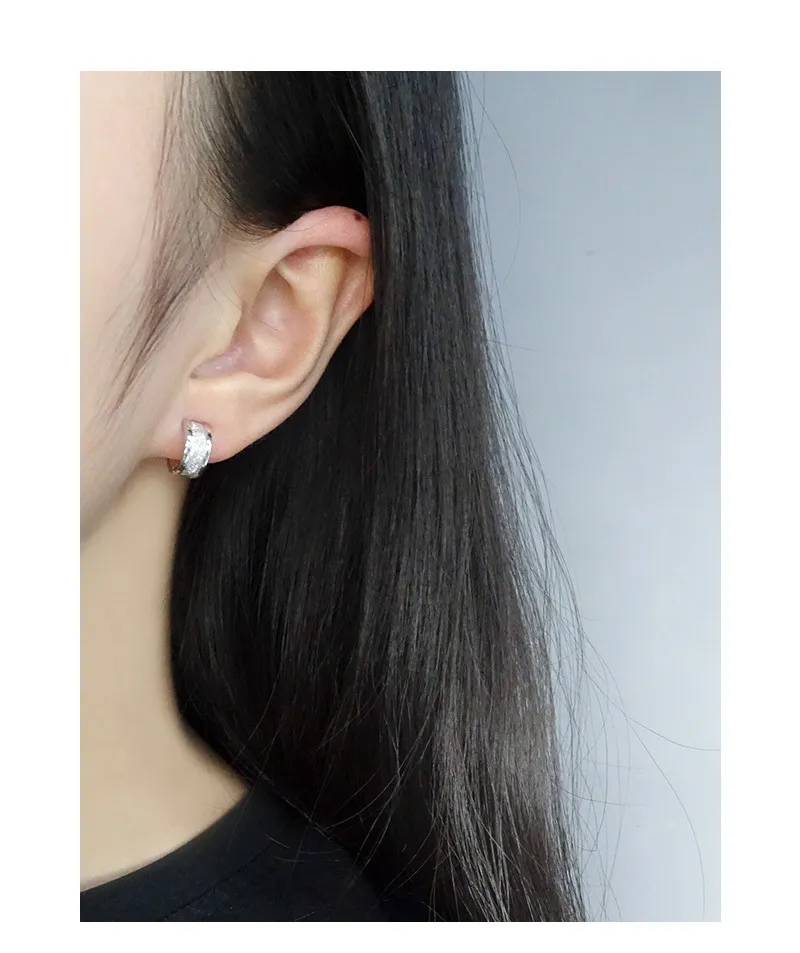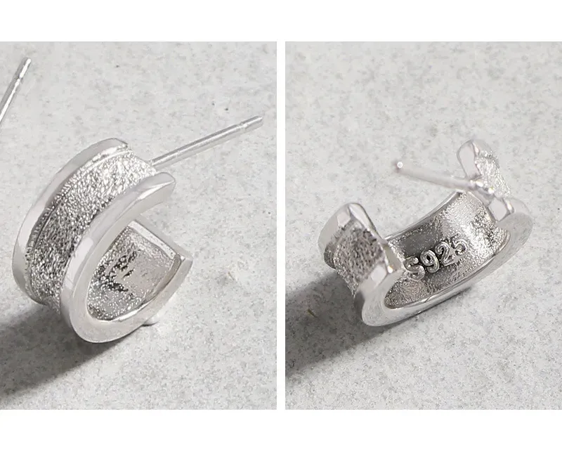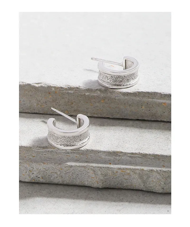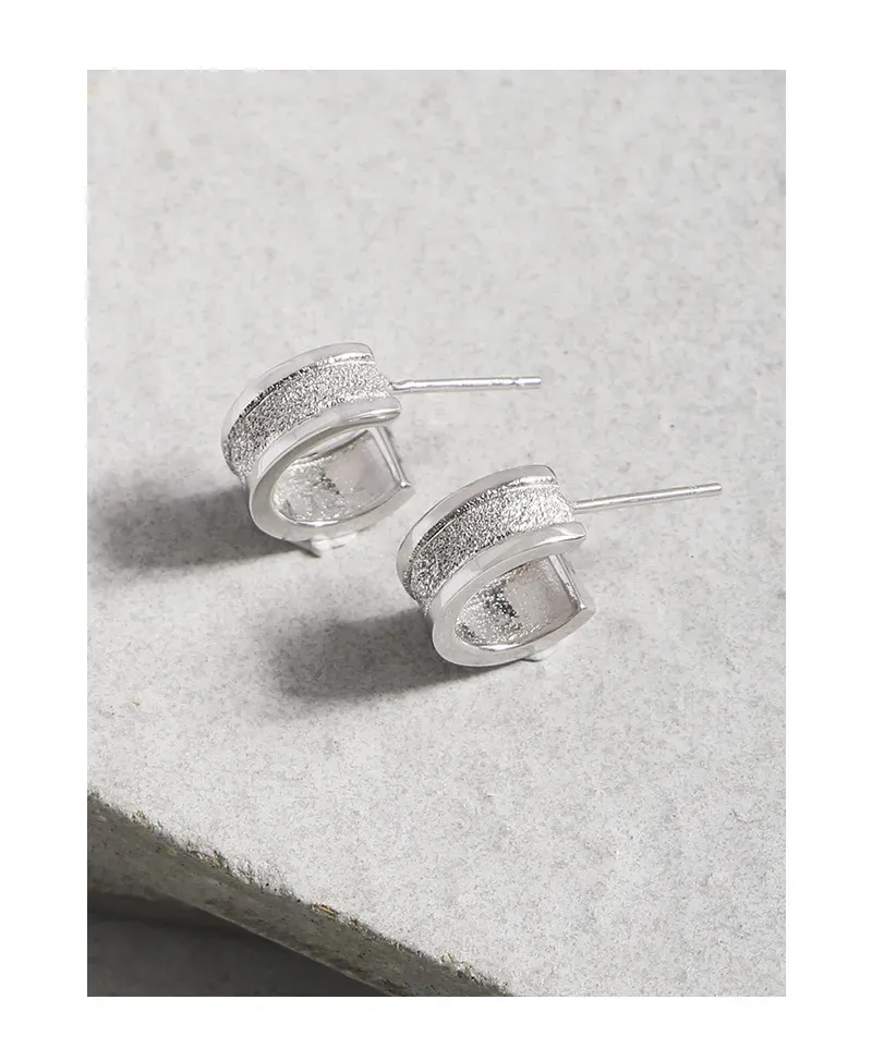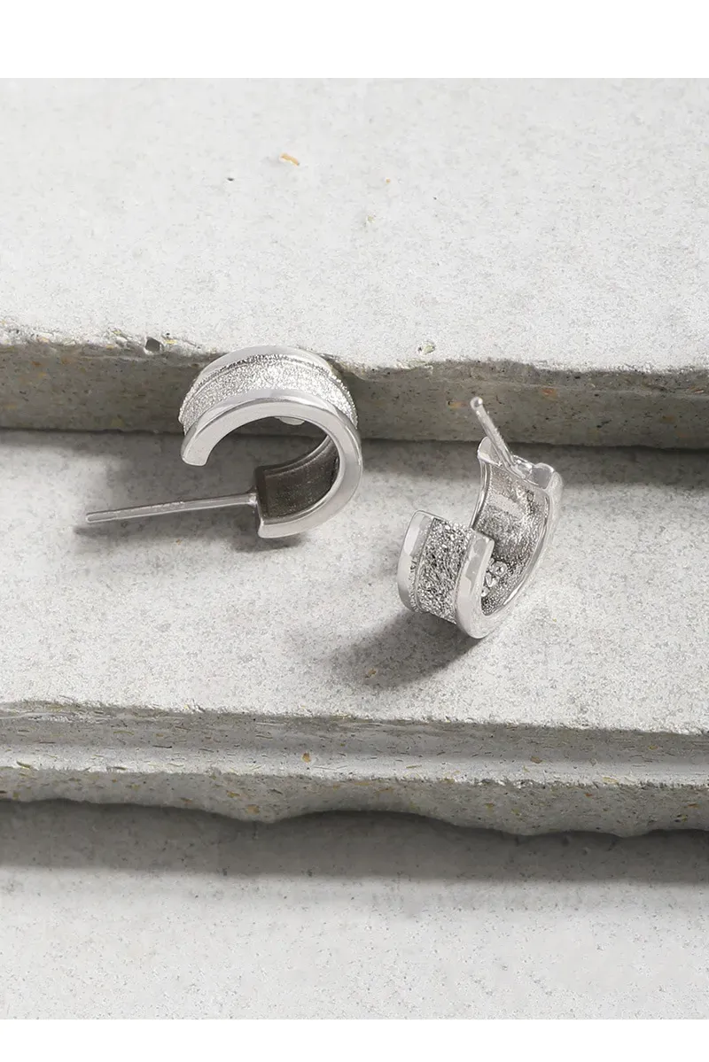 Each earring features a delicate huggie hoop design, embracing the earlobe with subtle elegance. The outer and inner bands boast a sleek, polished silver finish, reflecting light with understated brilliance. Nestled between these smooth lines is a central band adorned with a fine, frosted texture, reminiscent of shimmering stardust or the intricate patterns found in nature. This unique finish catches the light, creating a sparkling effect that adds depth and intrigue to the design.