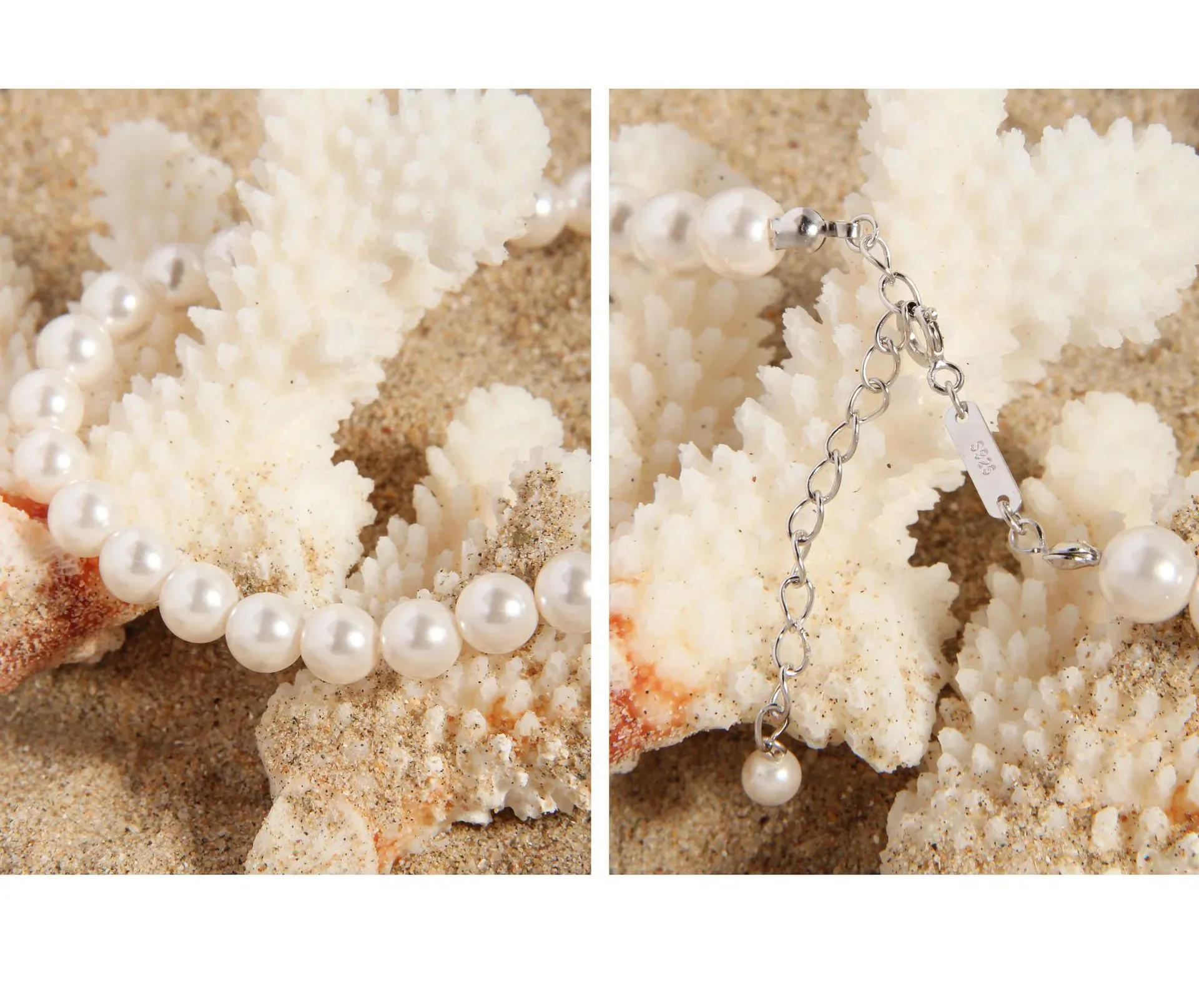 • Color: Each pearl boasts a radiant, creamy white hue, offering a soft, luminous glow reminiscent of moonlight. The adjustable extender chain and clasp feature a polished silver tone, providing a sleek contrast.