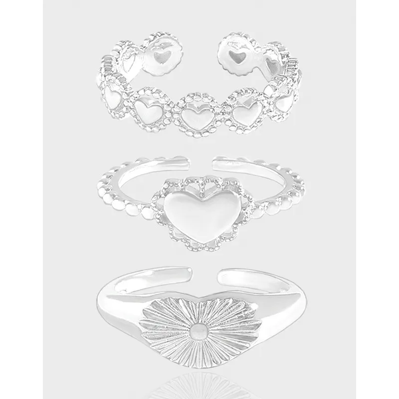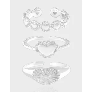 • The third ring showcases a bold heart-shaped signet adorned with a radiant sunburst motif, symbolizing light, vitality, and the vibrant energy found in nature’s diverse patterns.