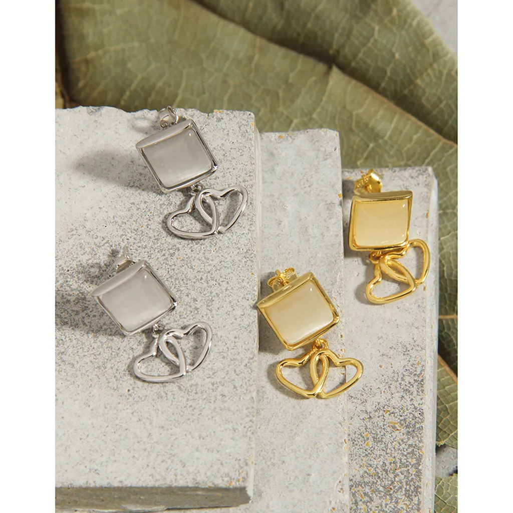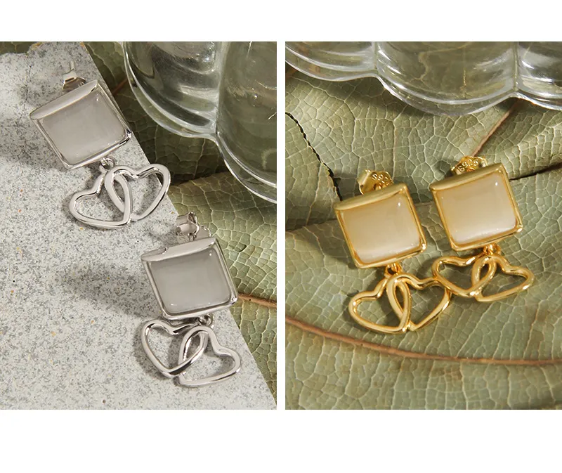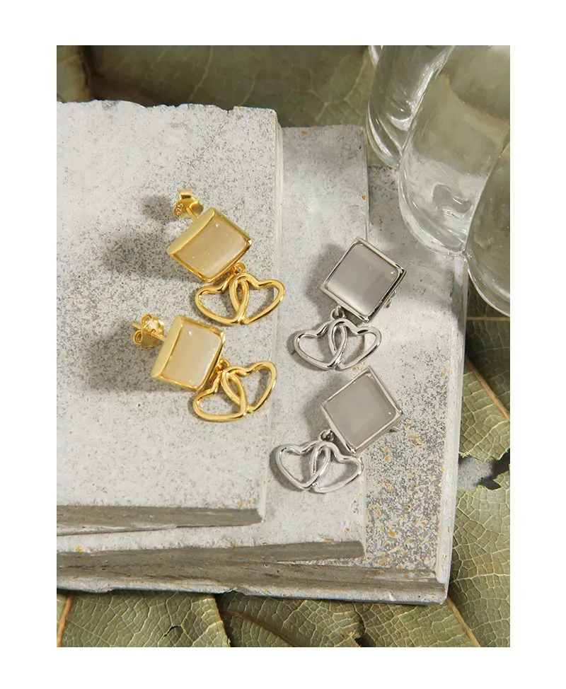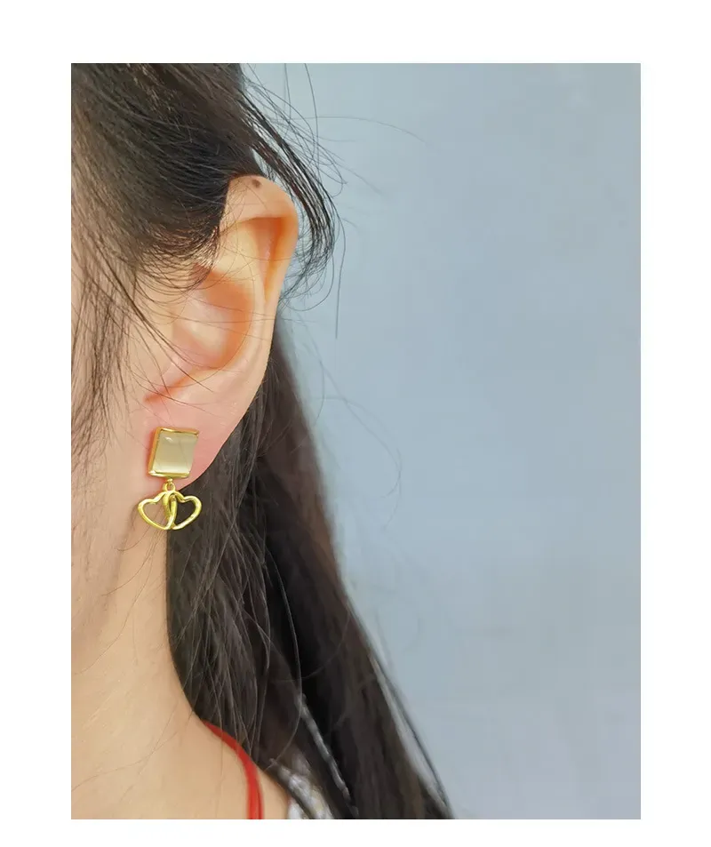 • Patterns & Textures: Crafted from polished gold, the metal offers a smooth, reflective texture that catches and plays with light. The striking feature is the pair of intricately intertwined hearts, symbolizing connection and unity, much like the perfect synergy found in nature’s own patterns. The opalite inlay provides a subtle, translucent depth, enhancing the piece with its inherent, soft luminescence.