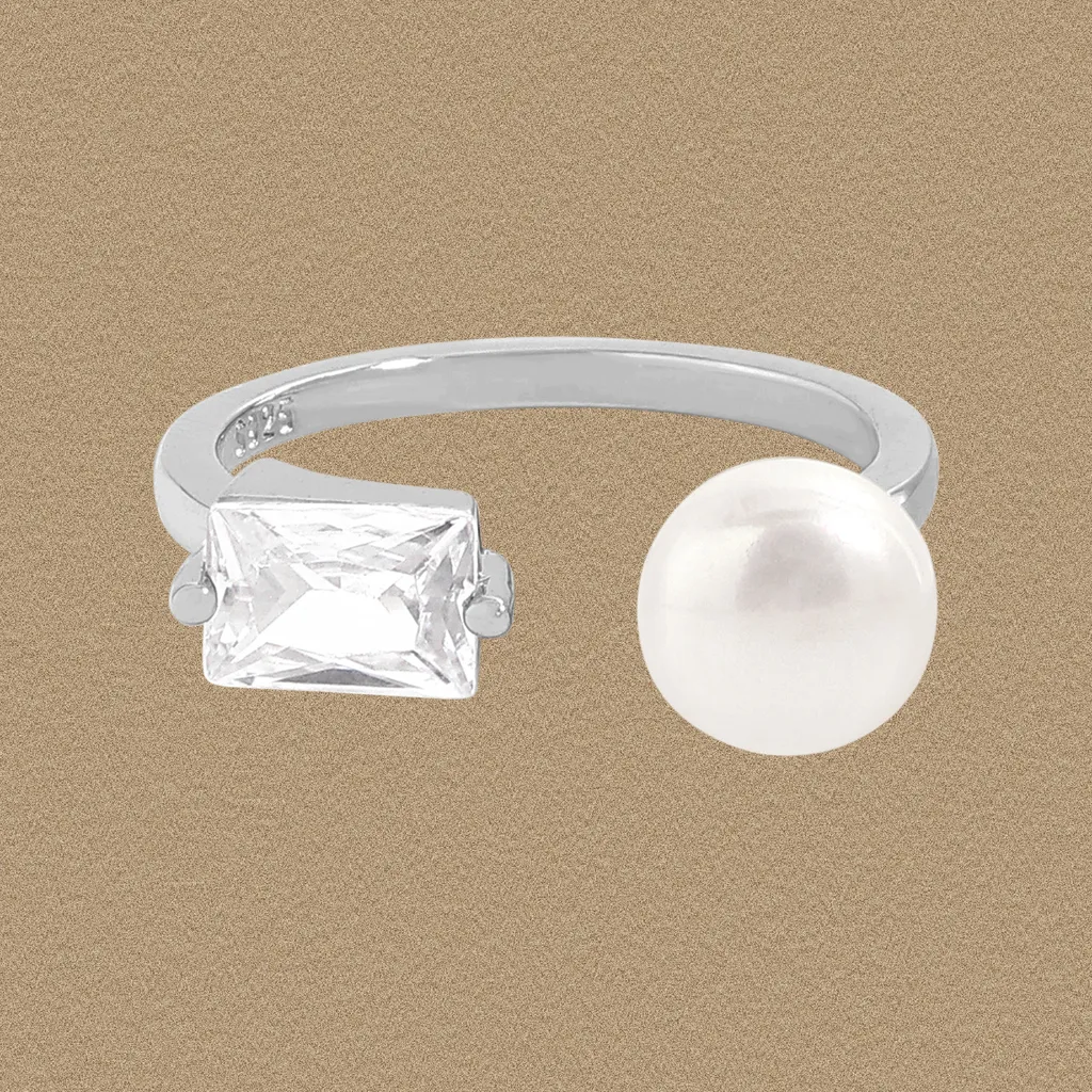 - Style: This contemporary open-end ring features a graceful, fluid silver band that bypasses the finger, culminating in two distinct focal points. One end is adorned with a precisely set, geometric-cut stone, while the other cradles a perfectly spherical pearl, creating an elegant asymmetry.