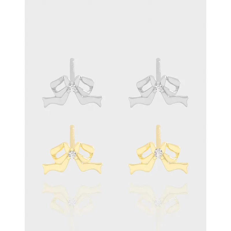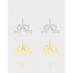 • Patterns & Textures: Each bow is meticulously crafted with a smooth, polished metallic texture that beautifully reflects light. The fluid, organic curves of the bow create a gentle, dynamic pattern. At the heart of each, a brilliant, clear round gemstone is securely set, evoking the sparkling depth of a distant star or a dewdrop kissed by dawn.