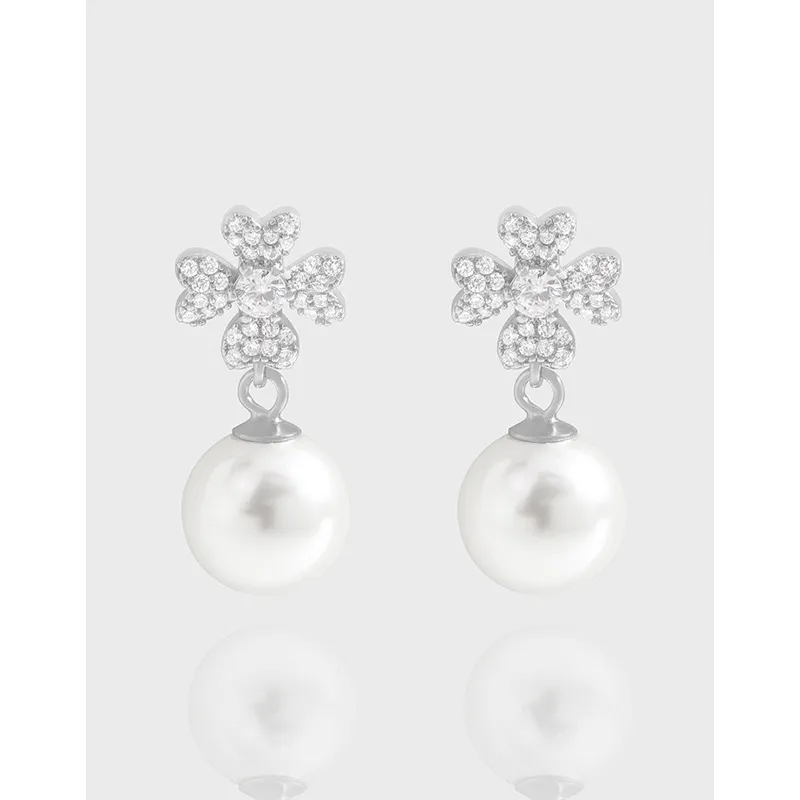 • Patterns & Textures: The prominent clover motif is meticulously crafted with a pave setting of numerous sparkling clear crystals, creating a dazzling, textured surface that brilliantly catches the light. This radiant design is beautifully complemented by a perfectly smooth, spherical white pearl, providing a rich, organic luster and a striking contrast in texture.
