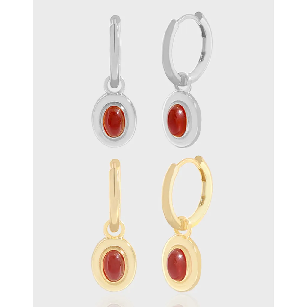 Embrace timeless elegance with these exquisite dangle hoop earrings, offered in both radiant gold-toned and sleek silver-toned finishes. Each earring features a captivating, smooth red cabochon stone, bringing a vibrant, natural hue to your look.