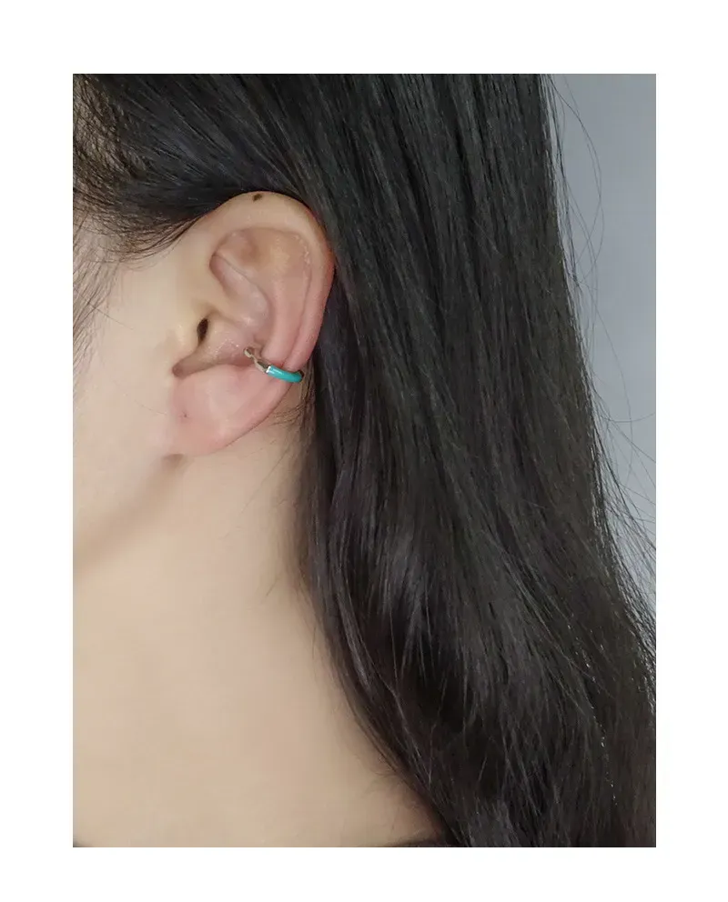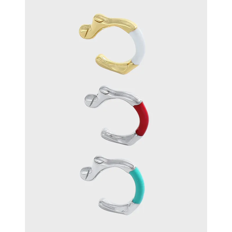 The distinctive C-shape boasts a smooth, polished metal surface, designed to reflect light with effortless grace. Its flowing, organic contours are balanced by a subtle, stylized detail at one end, adding a touch of structural artistry to its natural form. The contrasting enamel sections offer a brilliant, high-gloss texture, providing a vibrant pop of color and a luminous sheen that perfectly complements the metallic base. These cuffs embody a modern, versatile style, perfect for layering or as a singular piece of refined artistry.