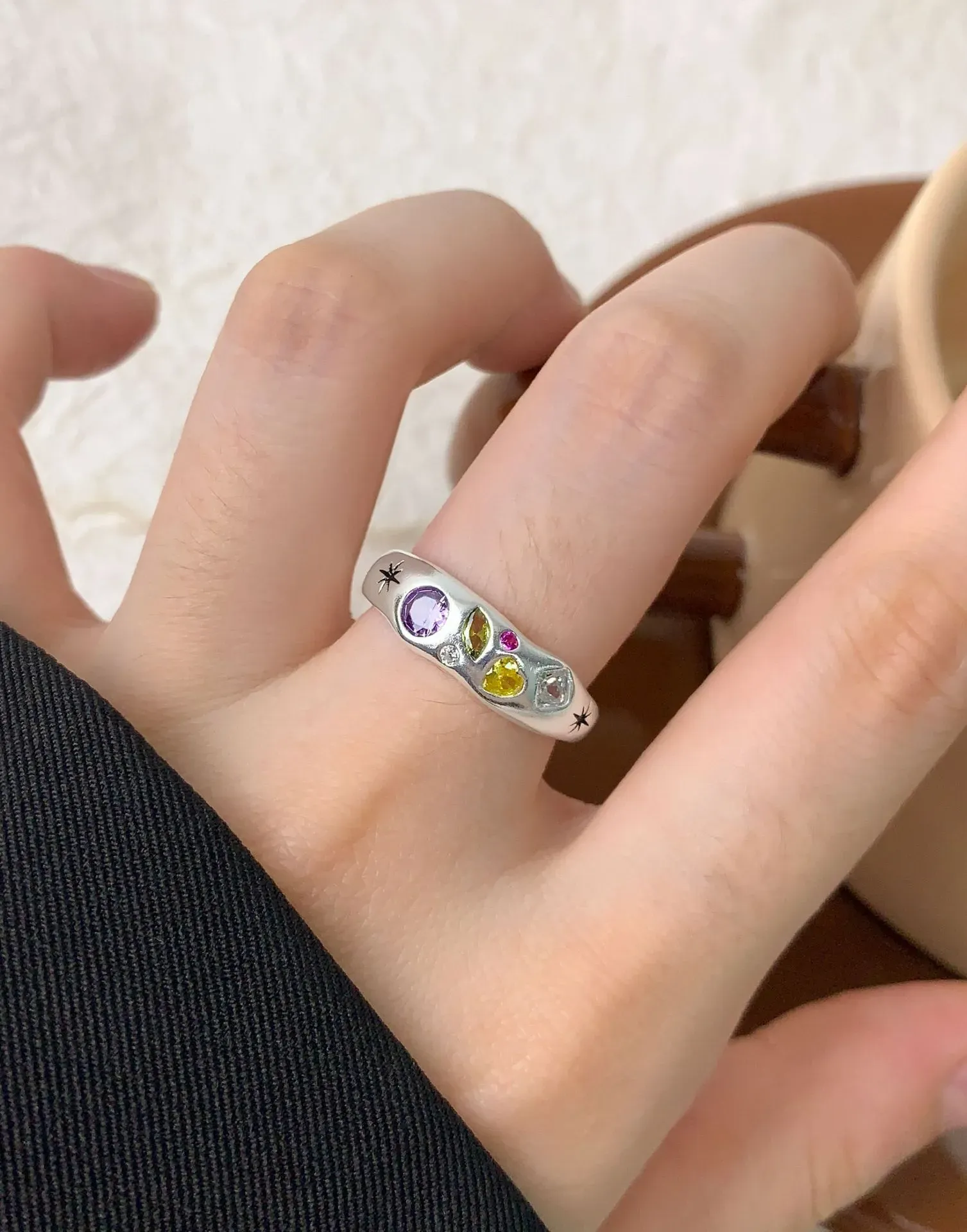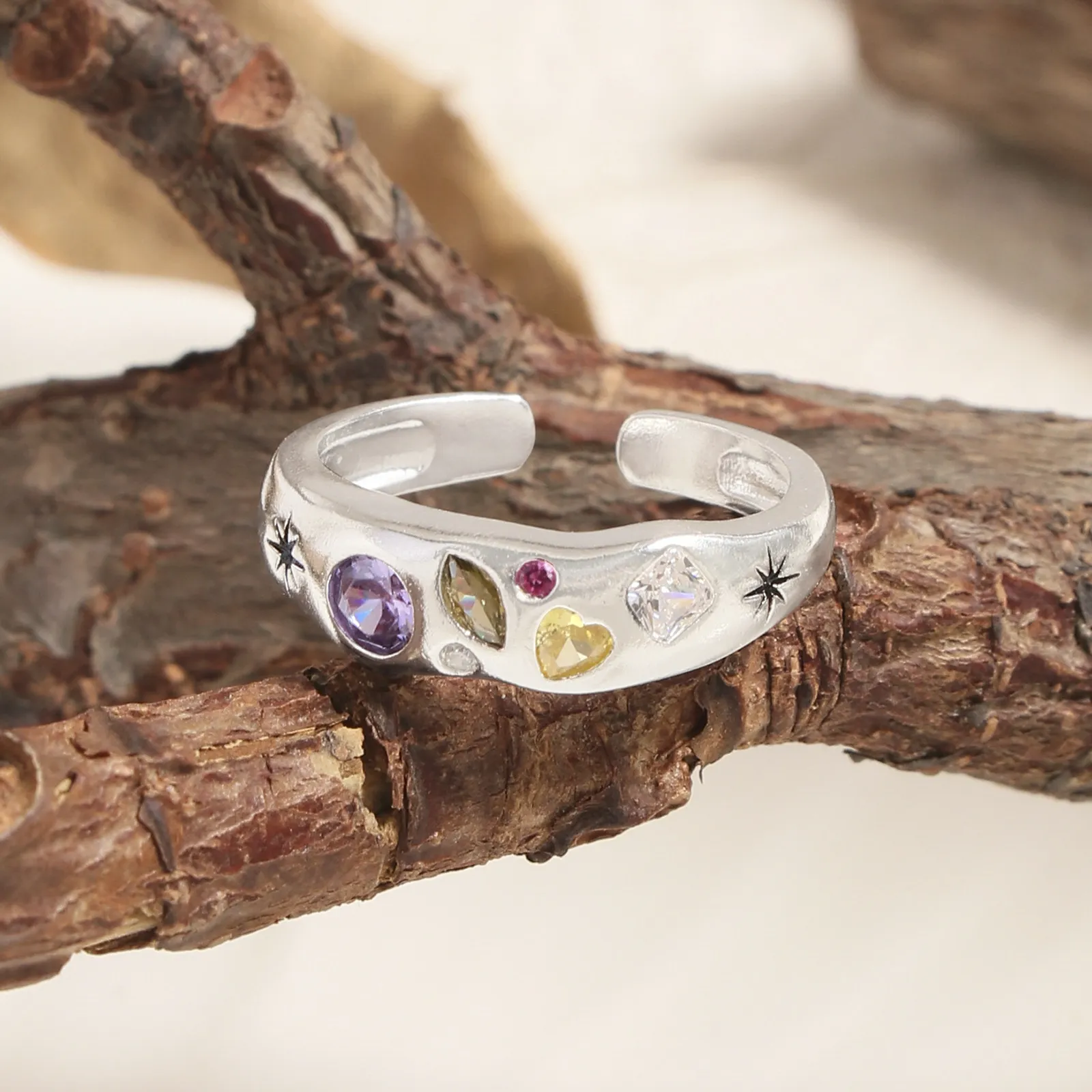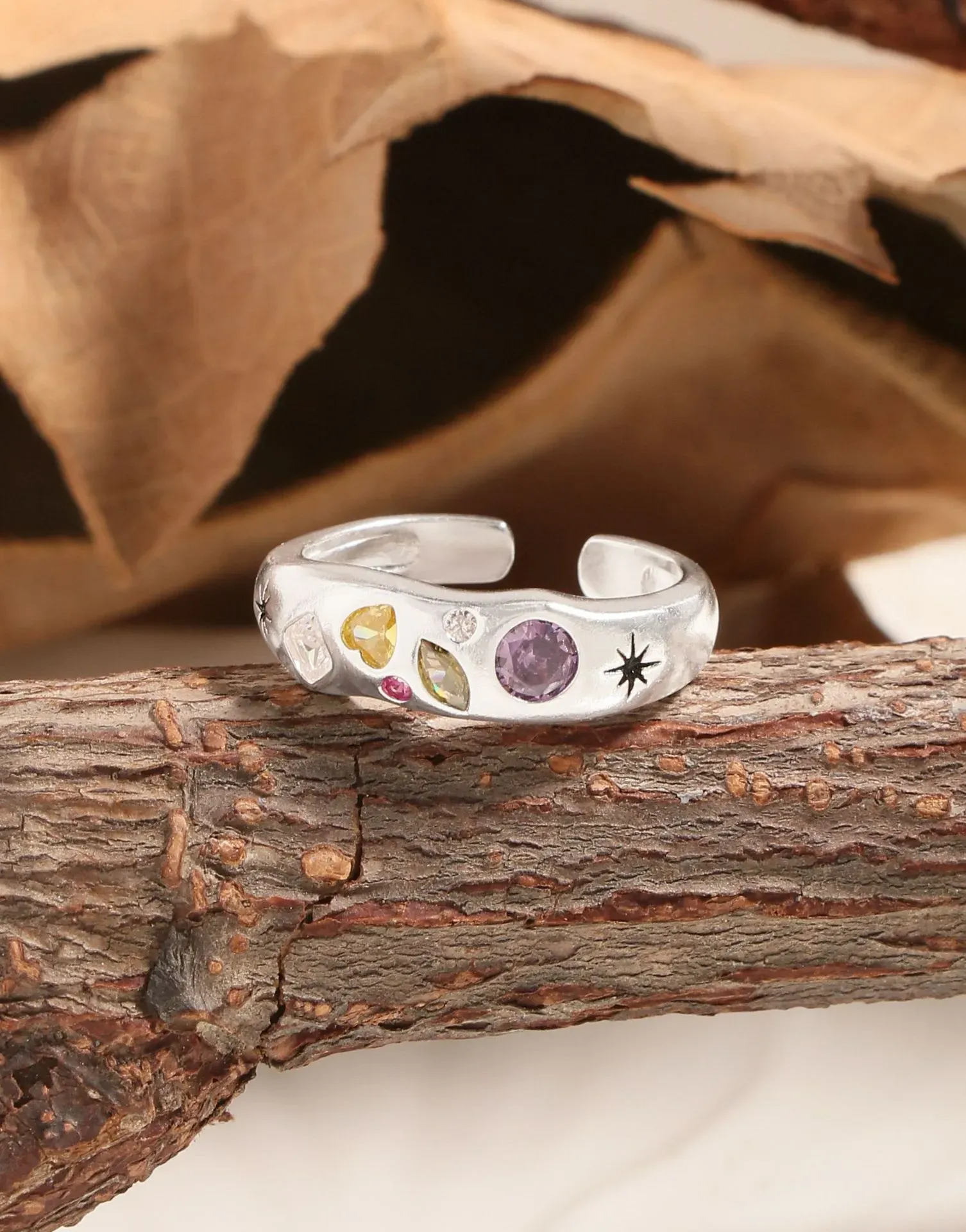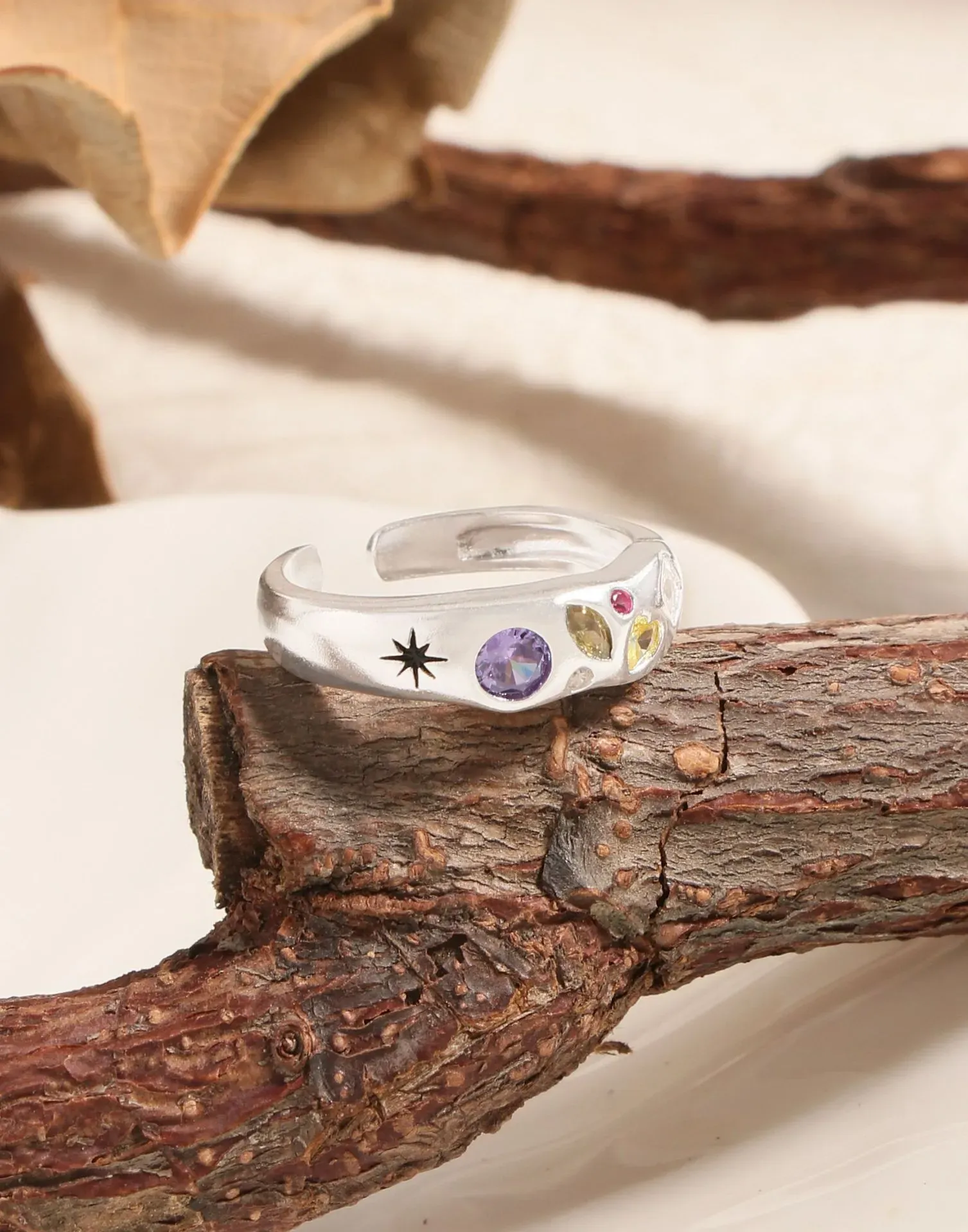 Crafted from polished silver, the band provides a radiant canvas for an exquisite array of gemstones. Deep purple, olive green, vibrant pink, sunny yellow, and clear crystals are meticulously set, complemented by two mysterious black engraved stars, evoking the shimmer of the night sky and the depth of nature’s hues.