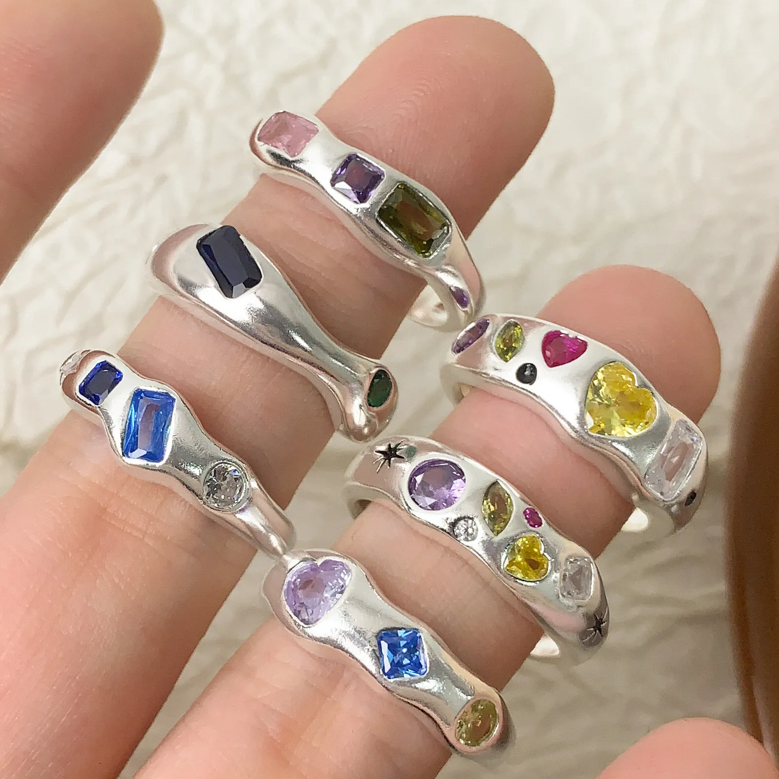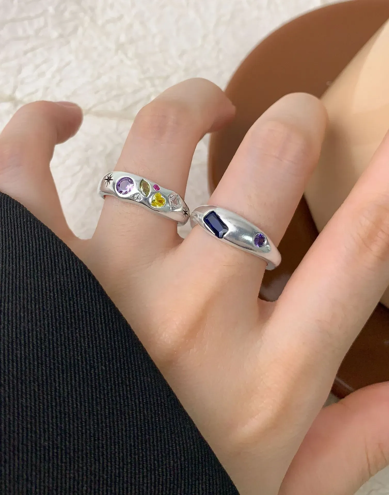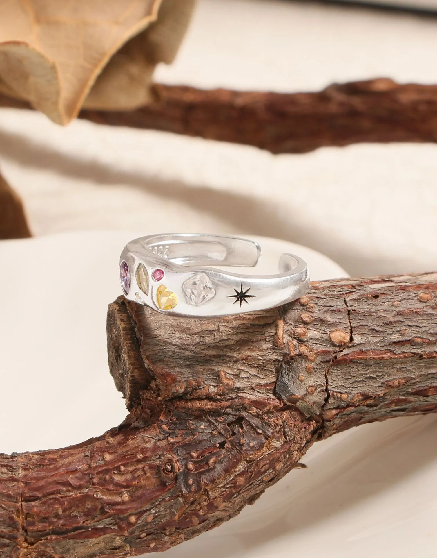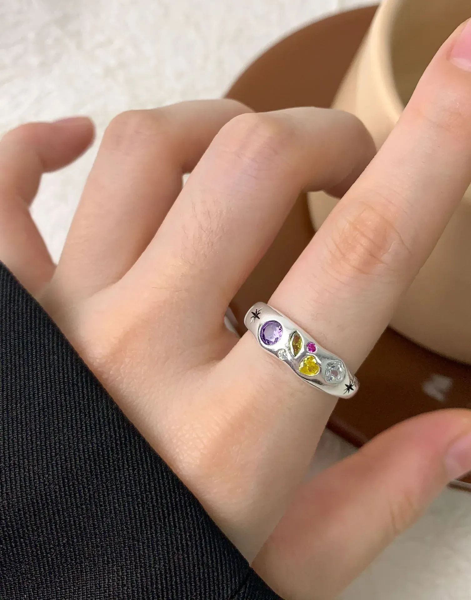Crafted from polished silver, the band provides a radiant canvas for an exquisite array of gemstones. Deep purple, olive green, vibrant pink, sunny yellow, and clear crystals are meticulously set, complemented by two mysterious black engraved stars, evoking the shimmer of the night sky and the depth of nature’s hues.