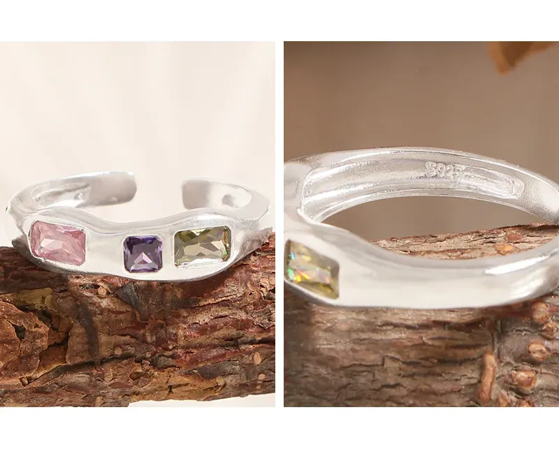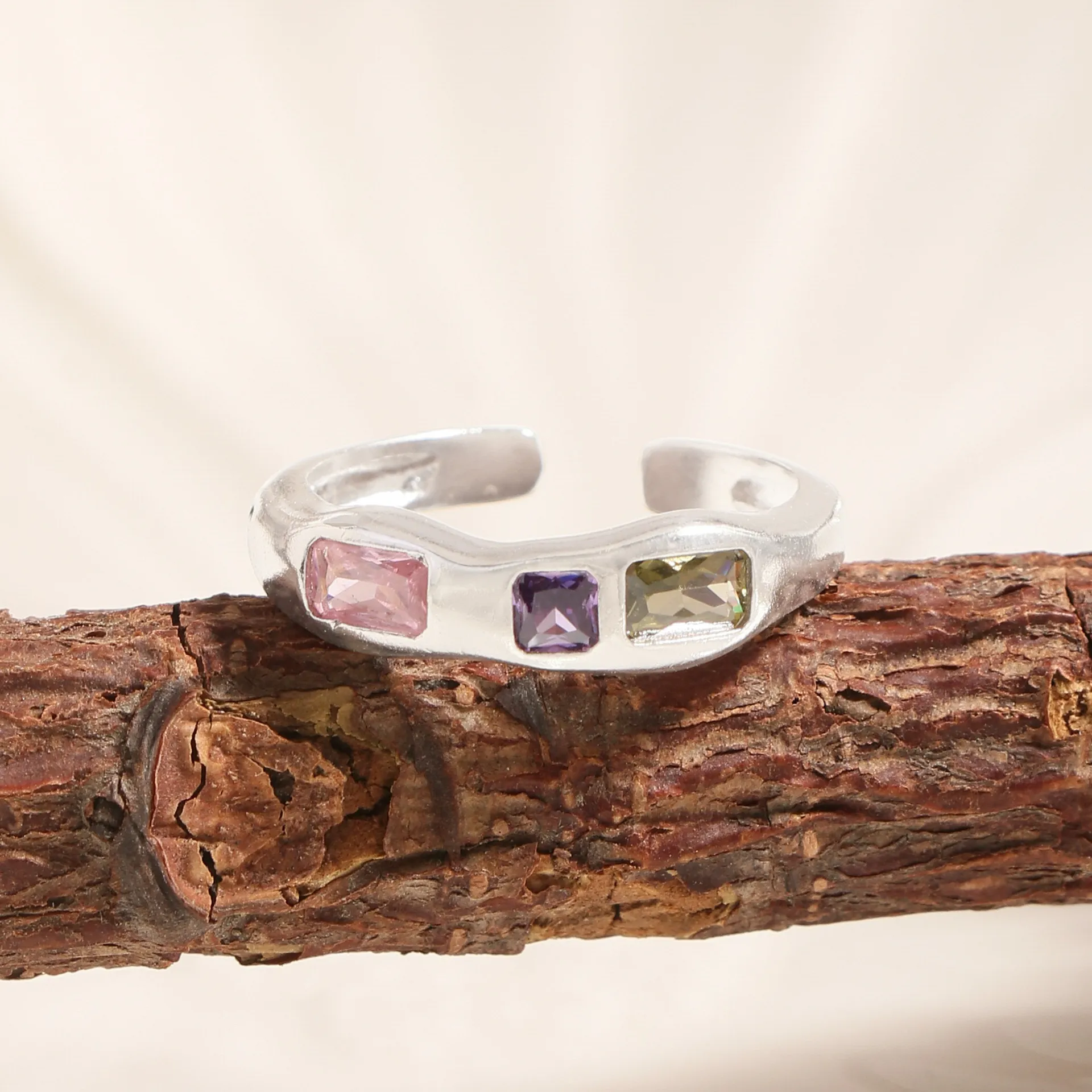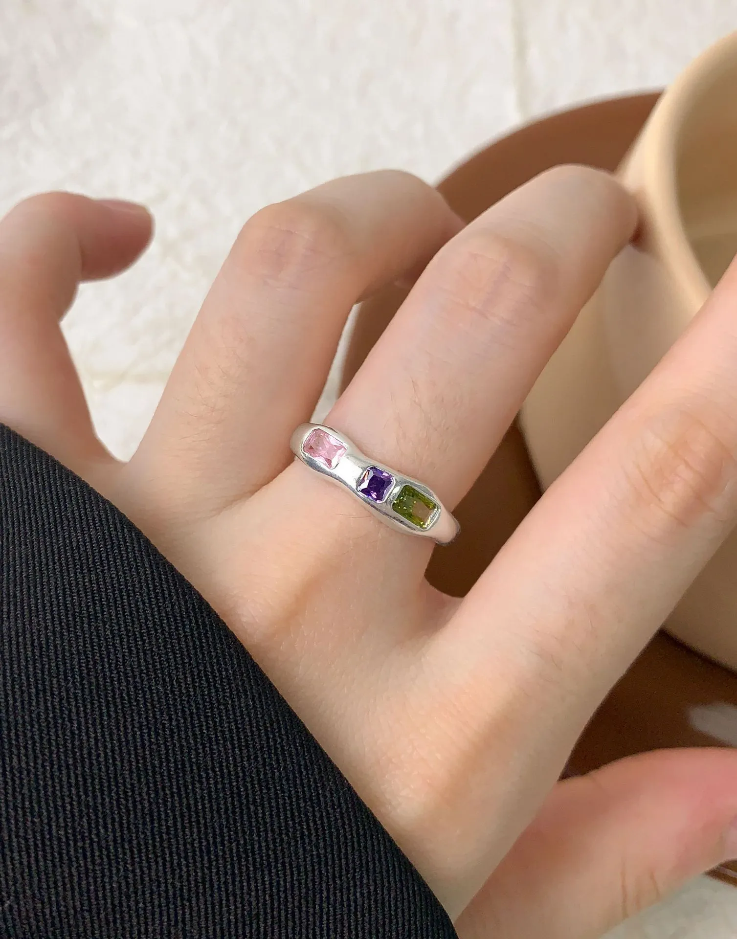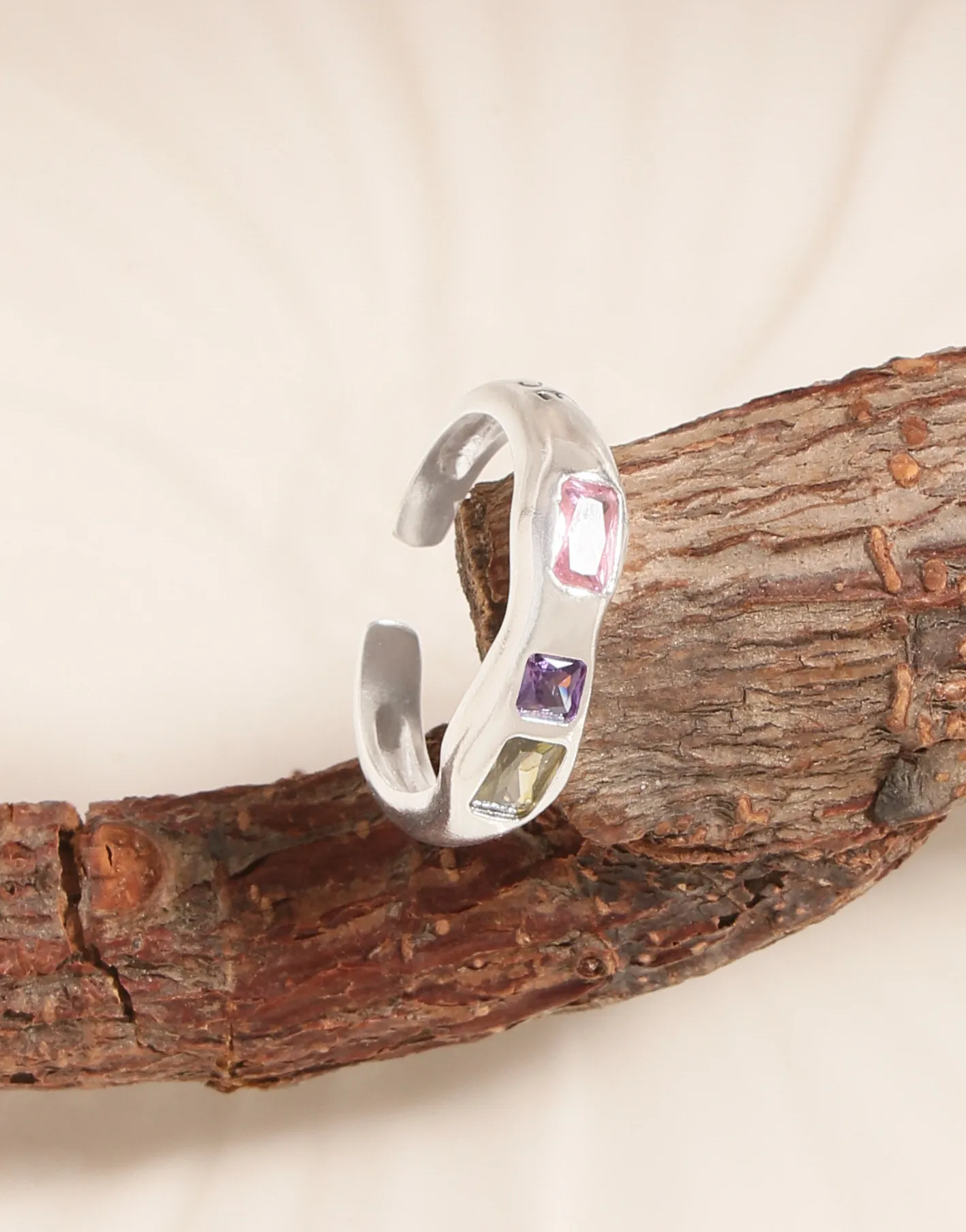 • Color: Crafted from polished sterling silver, this Pinia Ring features a captivating trio of bezel-set gemstones: a serene rectangular pink stone, a vibrant square amethyst purple stone, and a deep, earthy smoky grey stone. These celestial hues evoke the ever-changing brilliance of the northern lights.