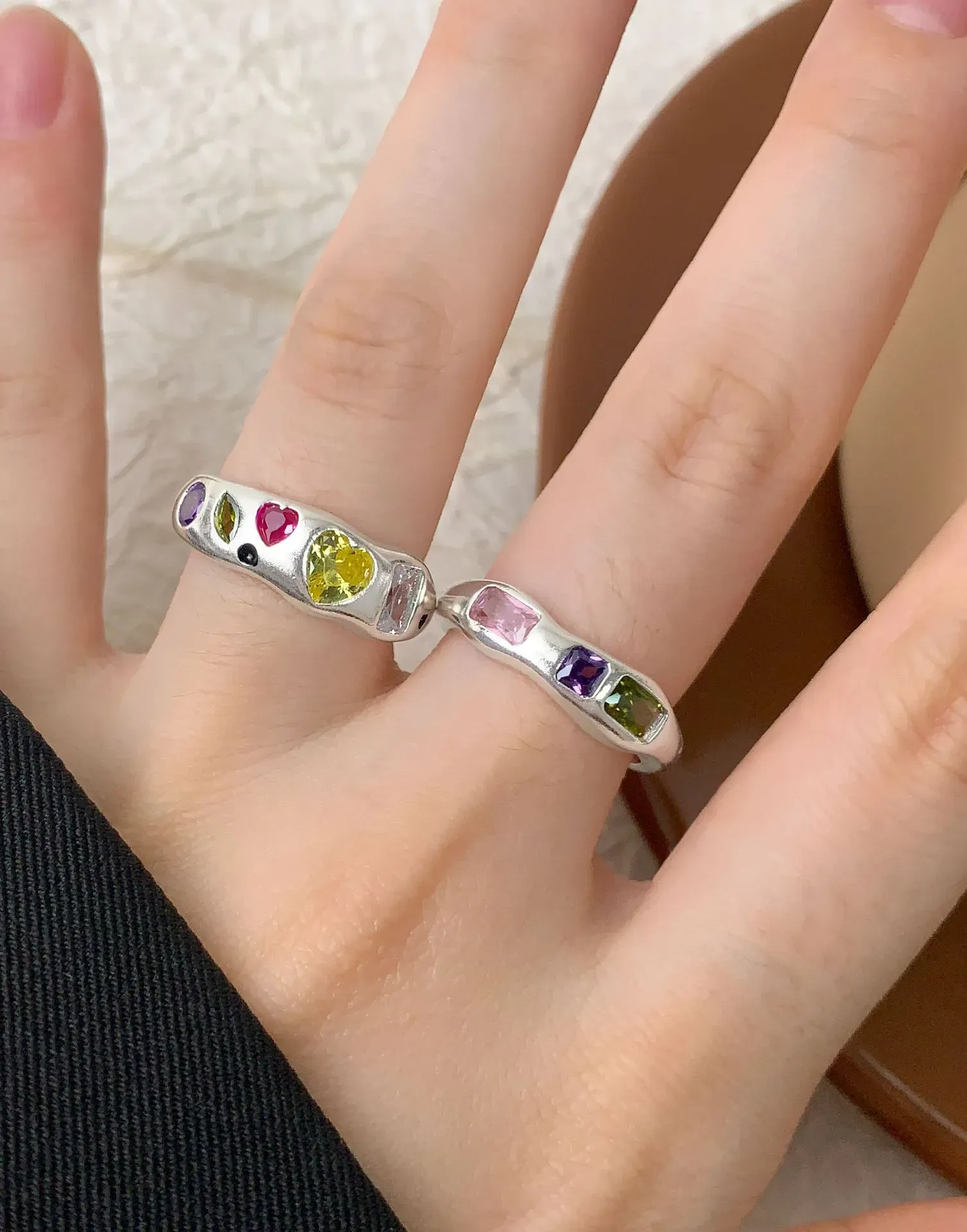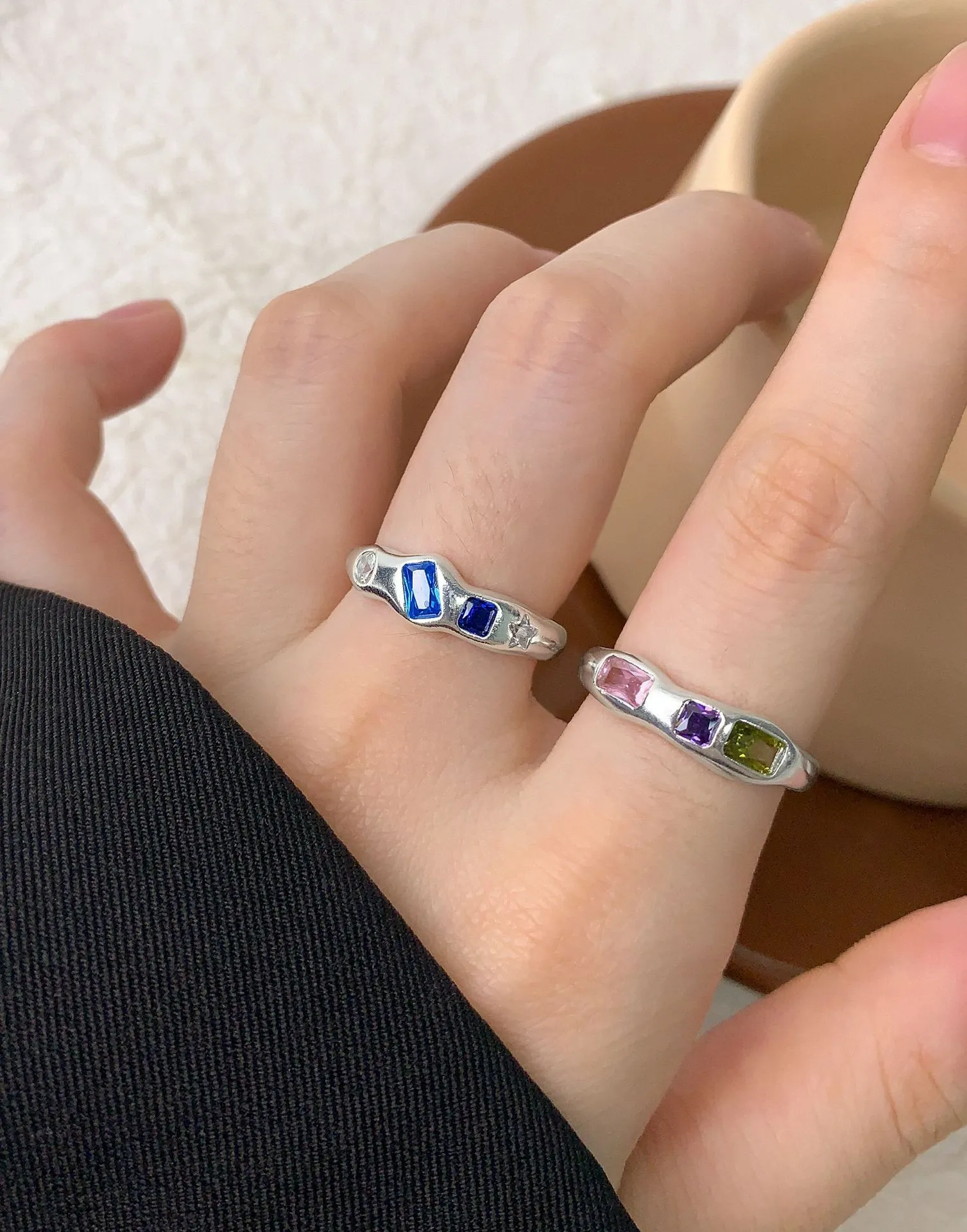 • Style: An adjustable, open-ended band with a naturally undulating silhouette, reminiscent of flowing rivers or shifting light. Its contemporary yet organic design cradles the three distinct gemstones, presenting them like stars in a night sky.