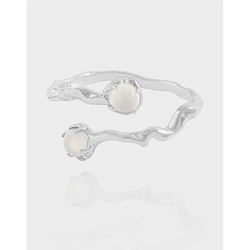 - Color: Crafted from polished silver-toned metal, featuPoria Ring two luminous, pearlescent white spheres, reminiscent of moonlight.