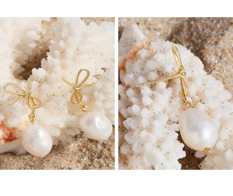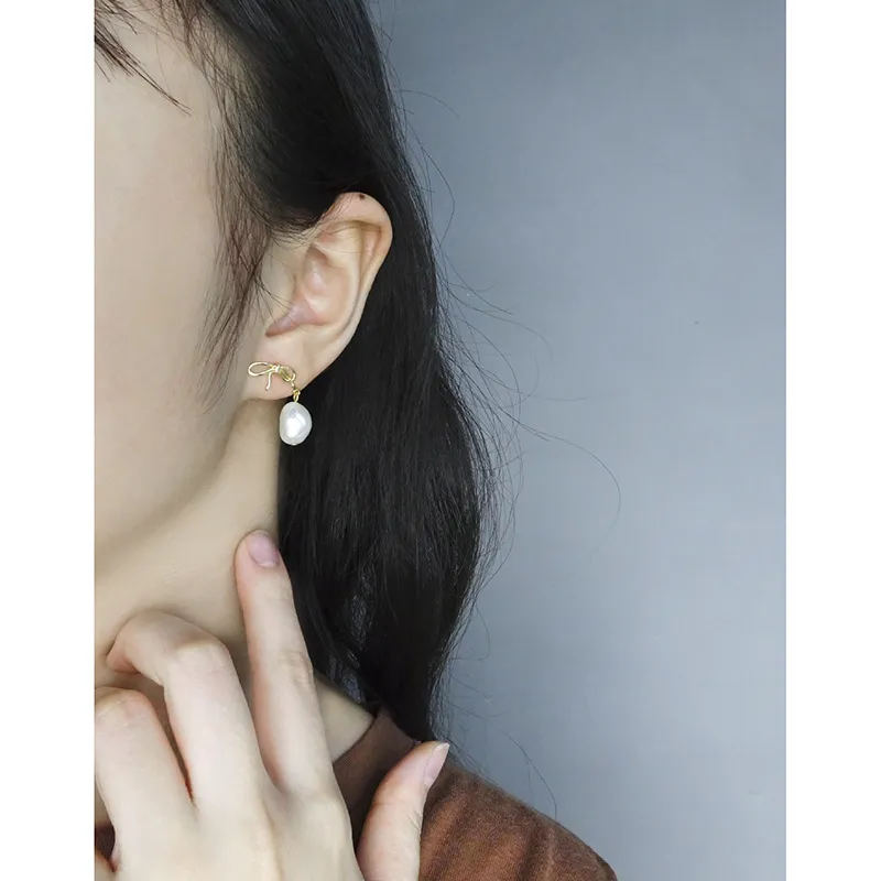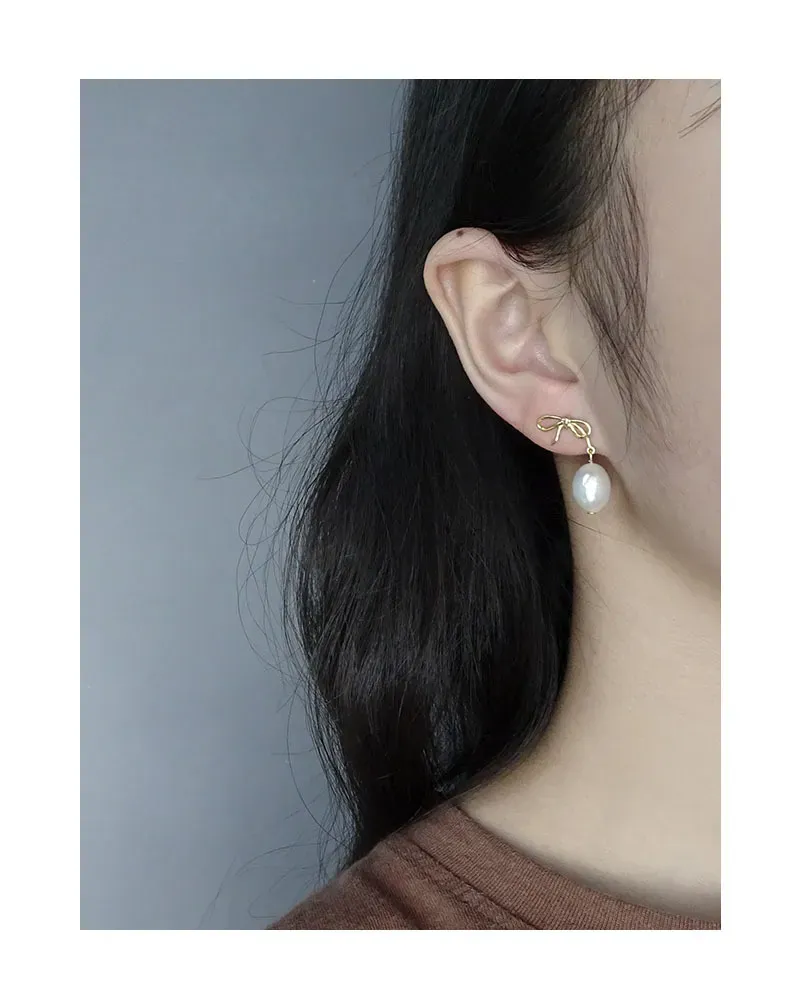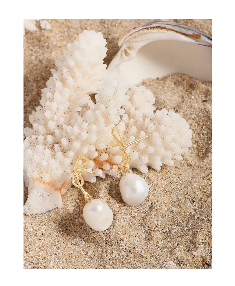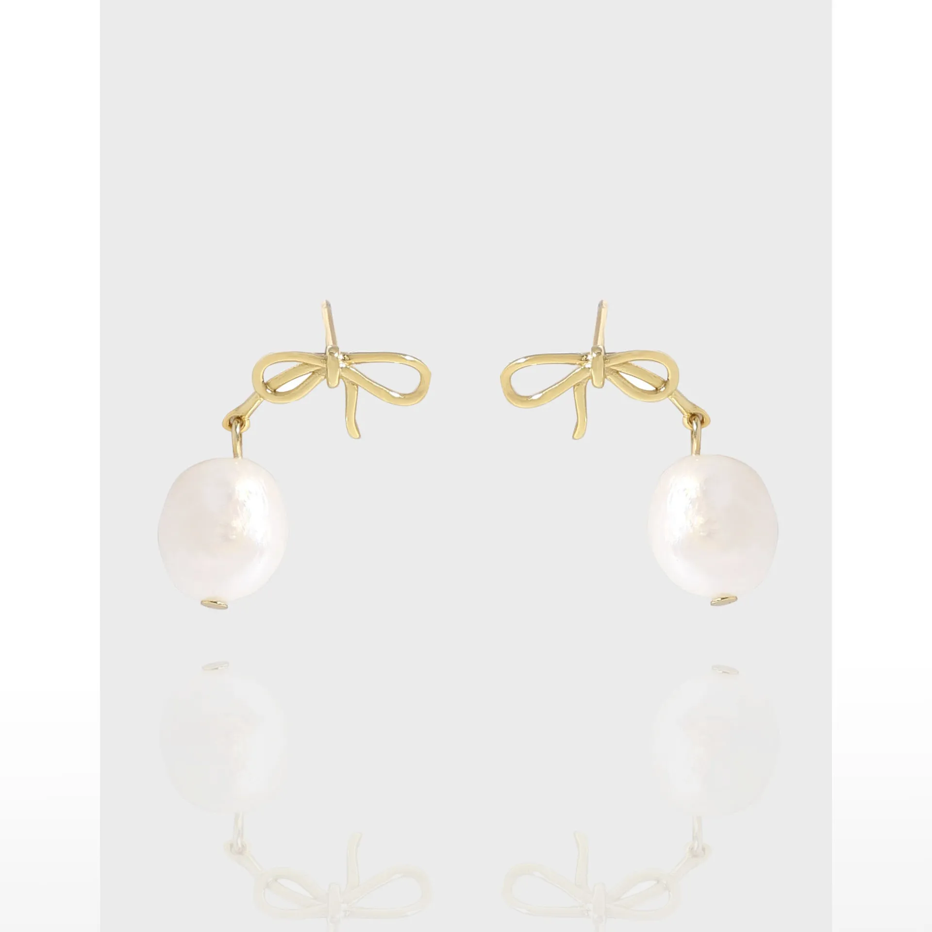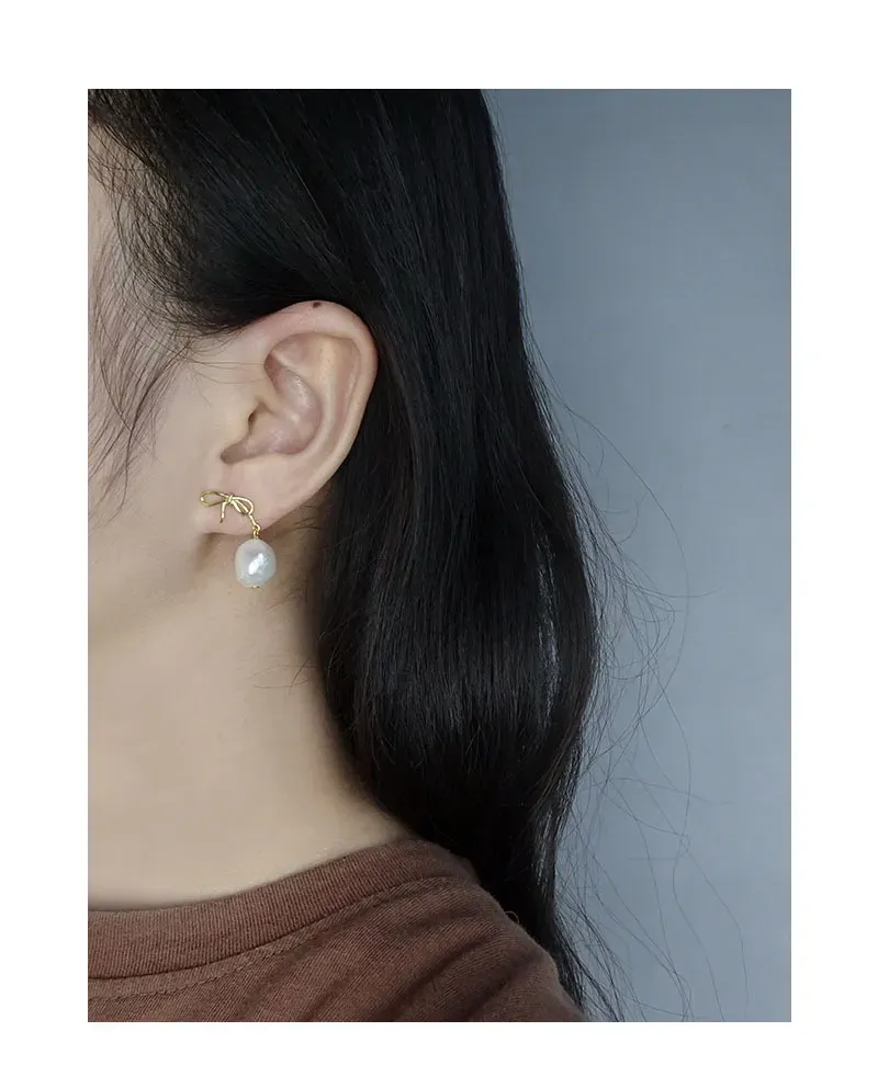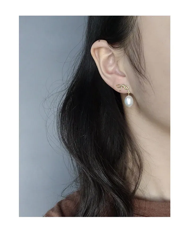 - Style: A testament to timeless elegance, these dangle earrings showcase a gracefully sculpted golden bow stud from which an irregular-shaped pearl softly hangs, creating a classic yet whimsical aesthetic.