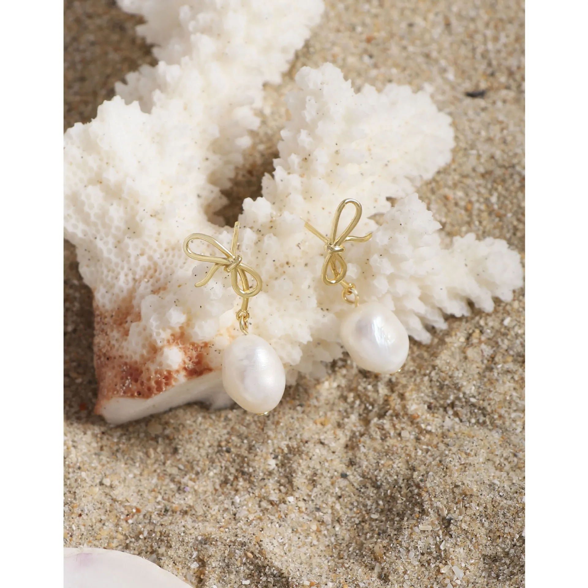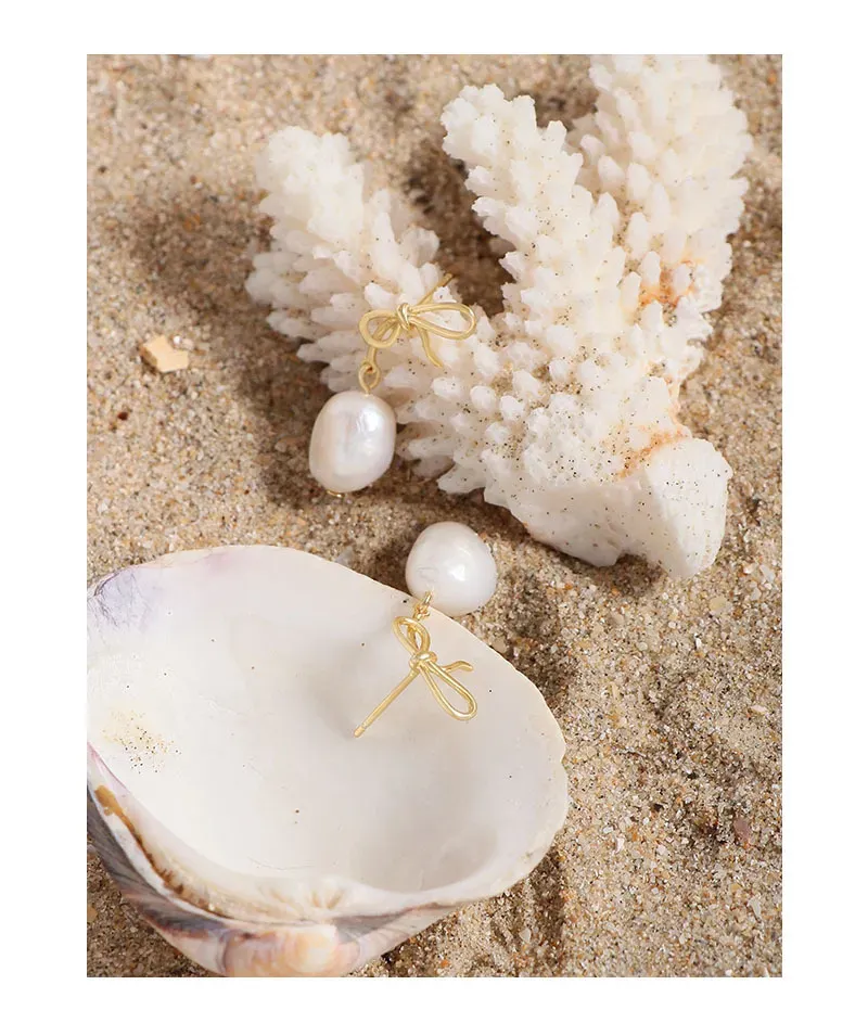 Ethereal Golden Bow & Baroque Pearl Drop Earrings