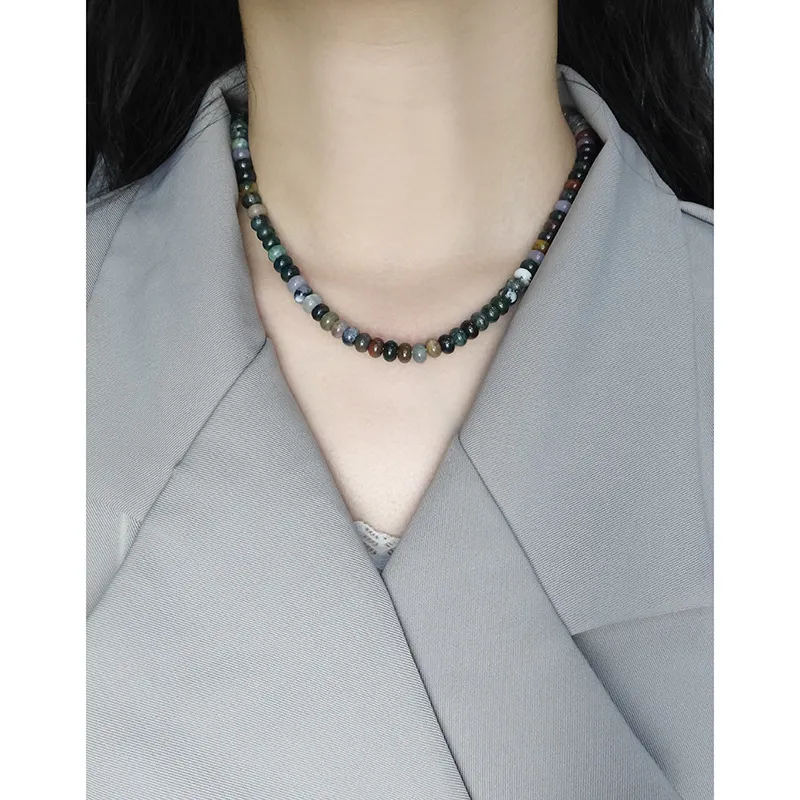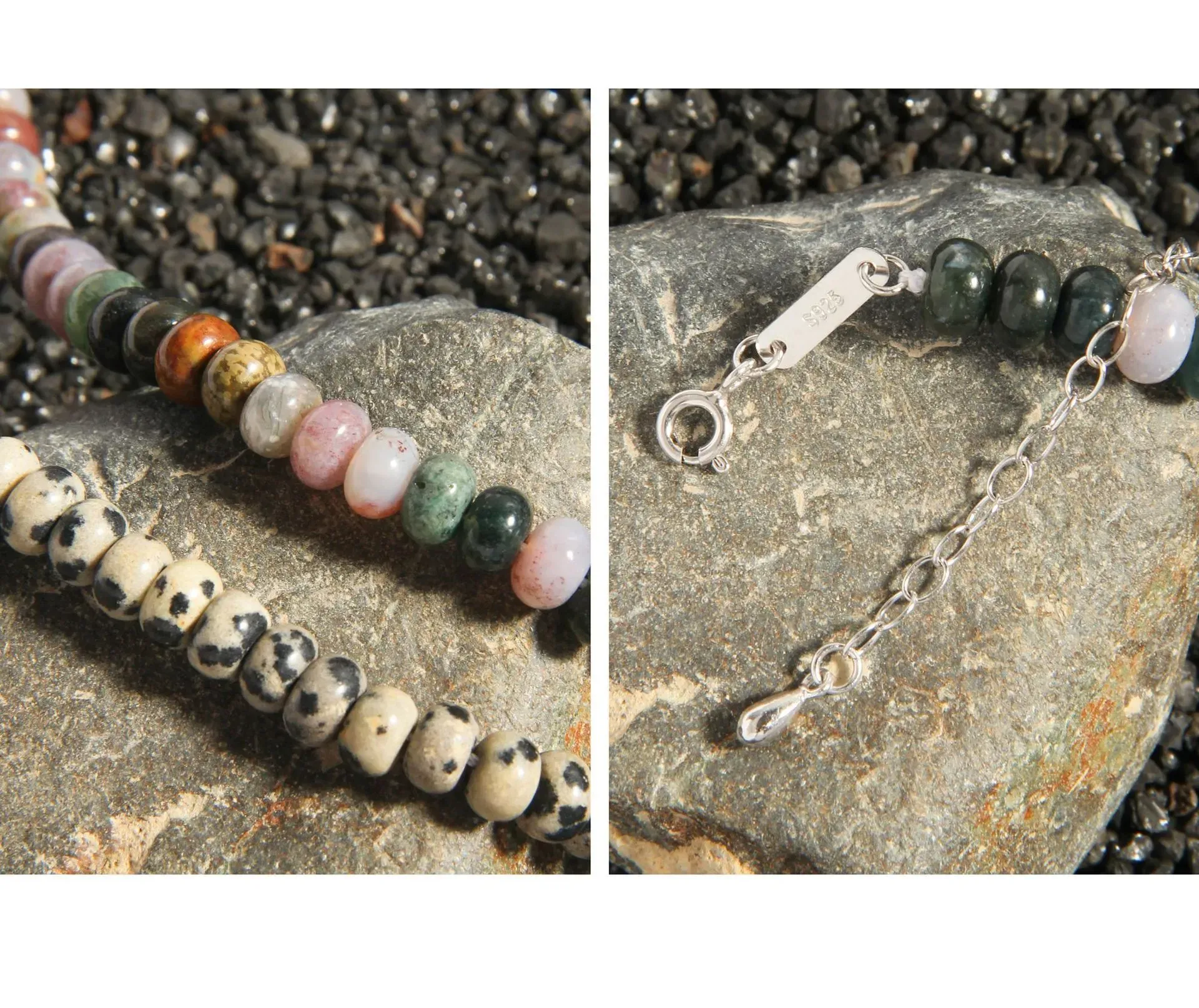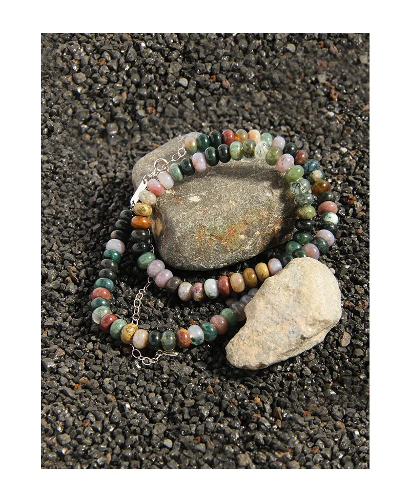 The unique, fluid style of this beaded piece highlights the raw textures and inherent patterns within each gemstone. Every bead tells a story with its subtle marbling, speckles, and variations, capturing the imperfect beauty and profound depth characteristic of natural artistry. This Pumah Necklace celebrates an organic elegance, reflecting the luminous and ever-changing brilliance inspired by nature’s patterns.