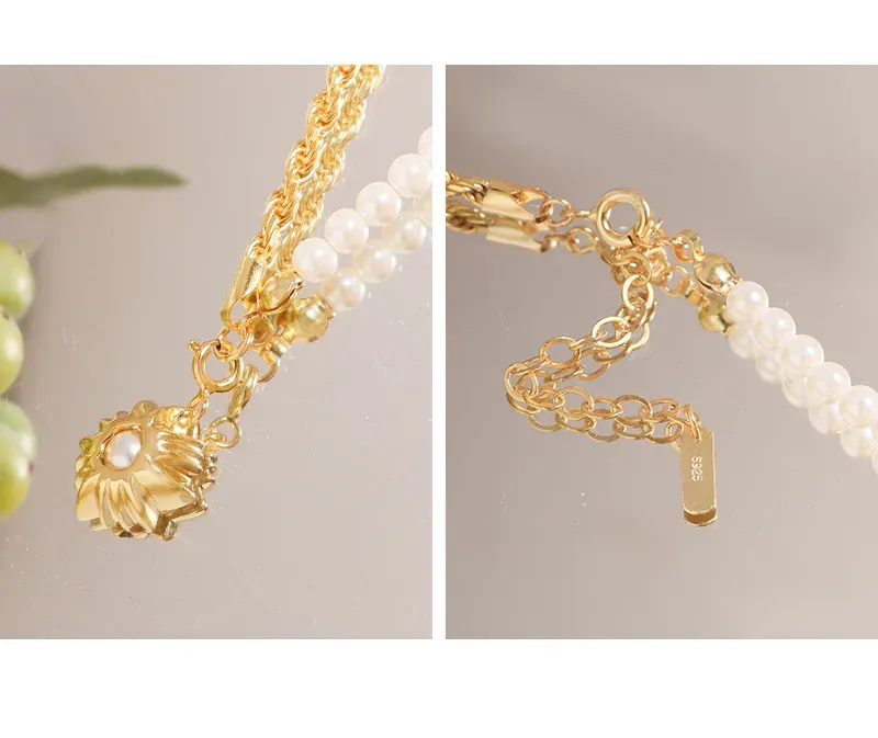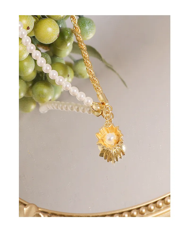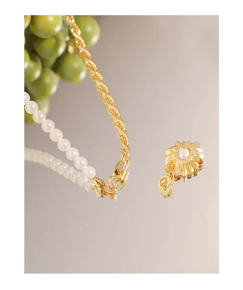 - Patterns or Textures: Experience the rich texture of the twisted gold rope chain, contrasting beautifully with the smooth, spherical form and soft glow of the pearls. The sunflower pendant showcases finely detailed, textured petals, embracing a central pearl that mimics the flower’s heart, embodying raw textures and the imperfect beauty of natural patterns.