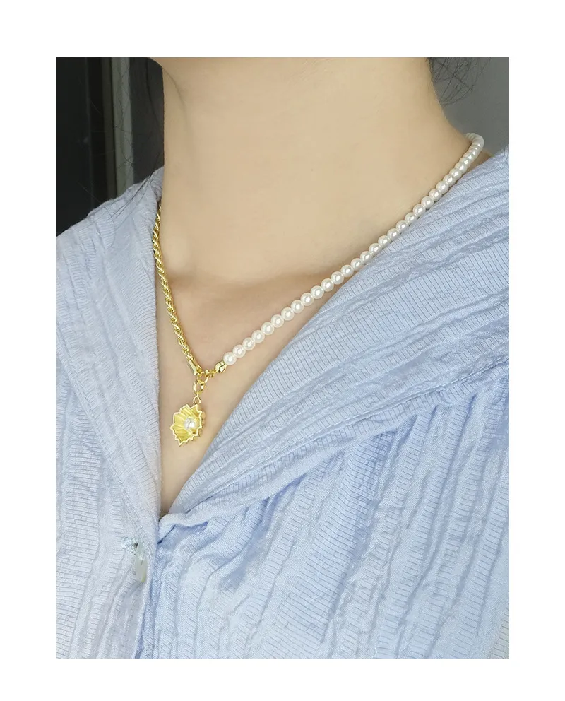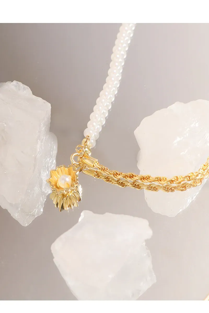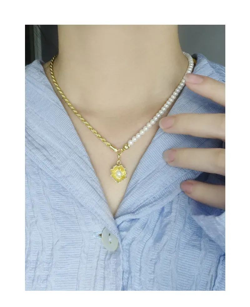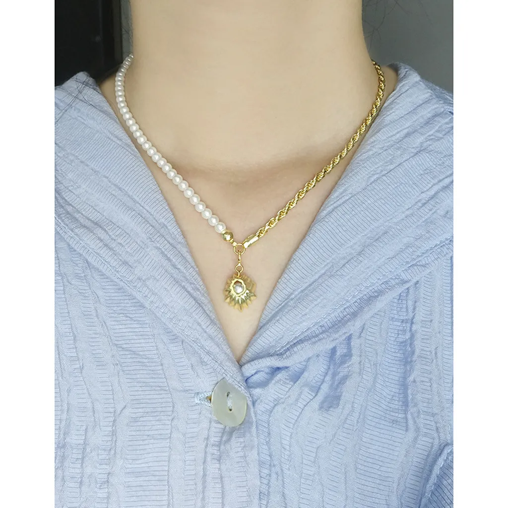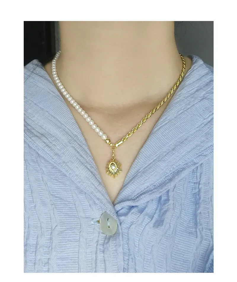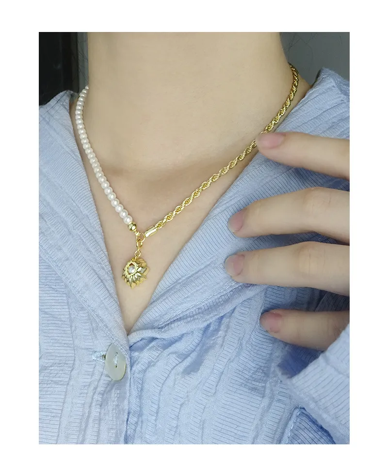 - Color: This piece harmoniously combines the radiant warmth of polished gold, seen in the robust rope chain and the intricate sunflower pendant, with the timeless, lustrous white hue of a strand of delicate pearls.