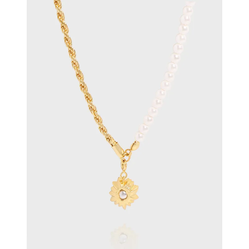 - Style: A modern classic, this Qaelindria Necklace features a distinctive asymmetrical design, where a sturdy gold rope chain meets a string of elegant pearls. The enchanting sunflower pendant adds a touch of whimsical, nature-inspired grace, making it a versatile accessory for any occasion.
