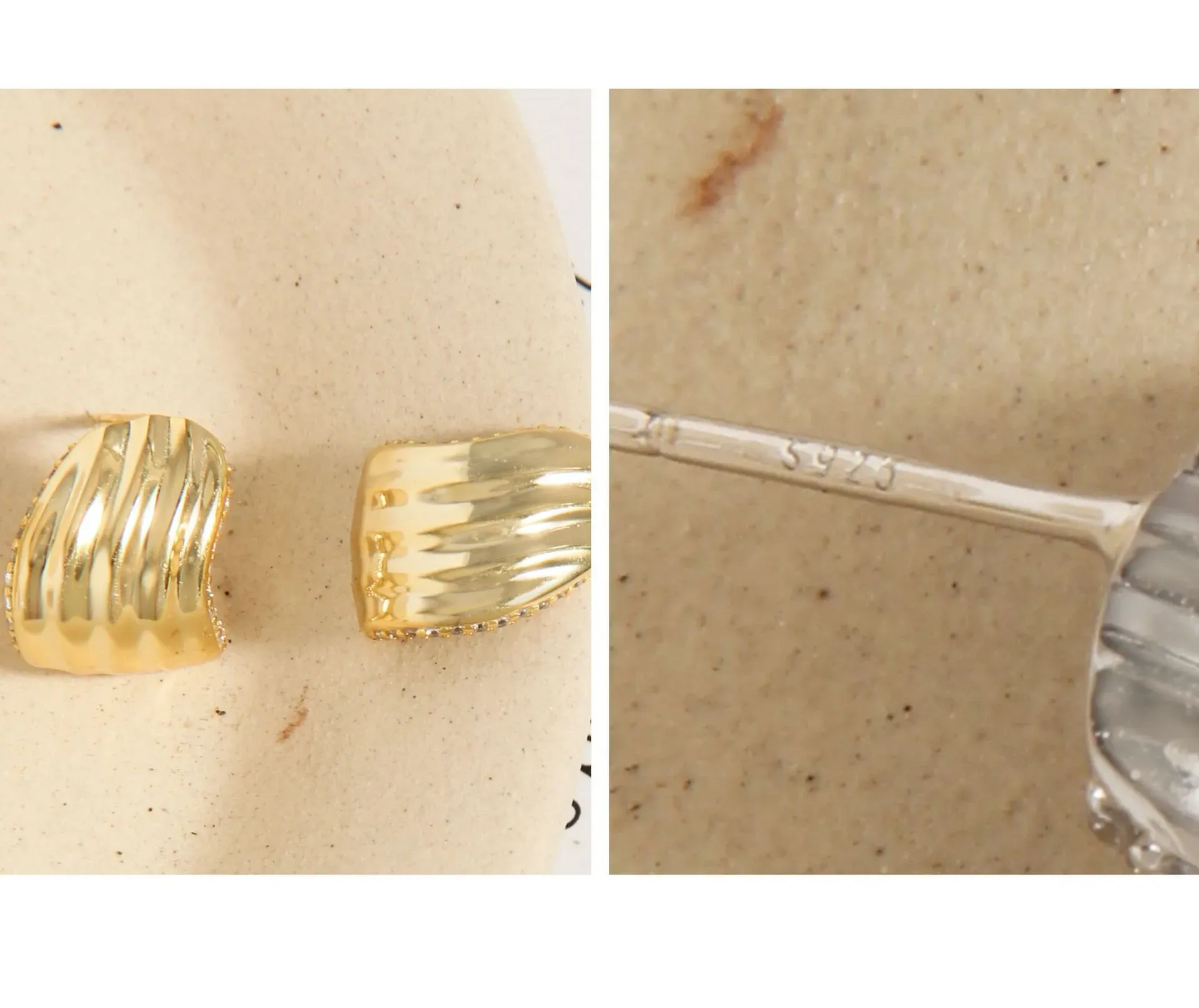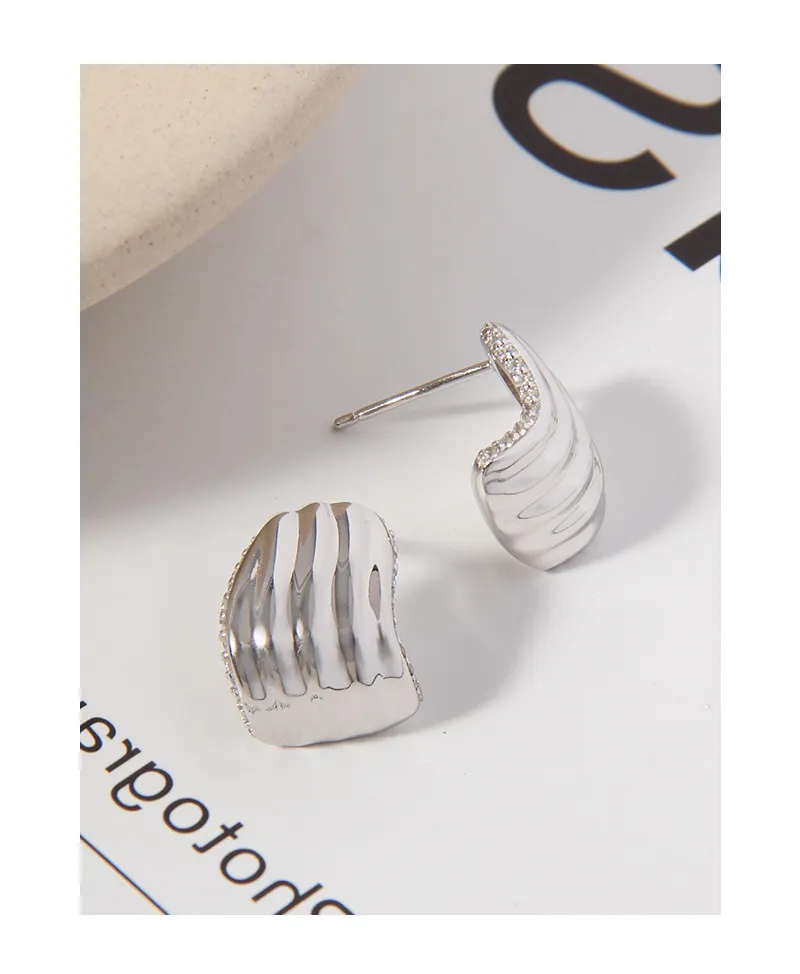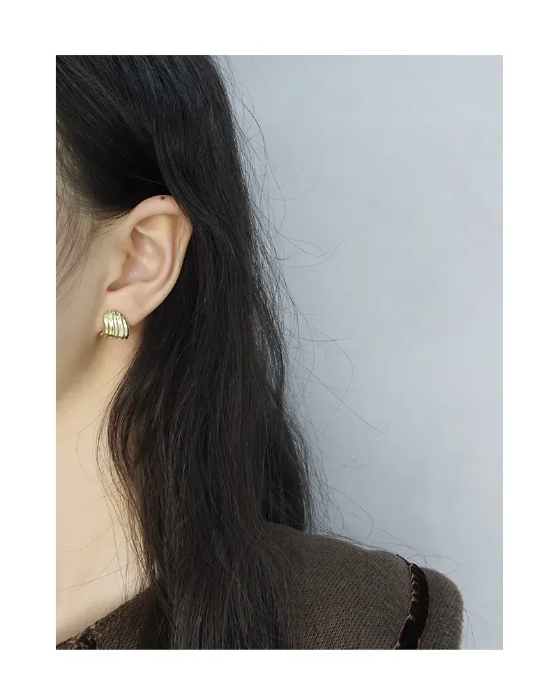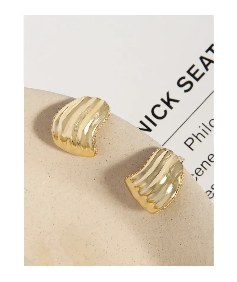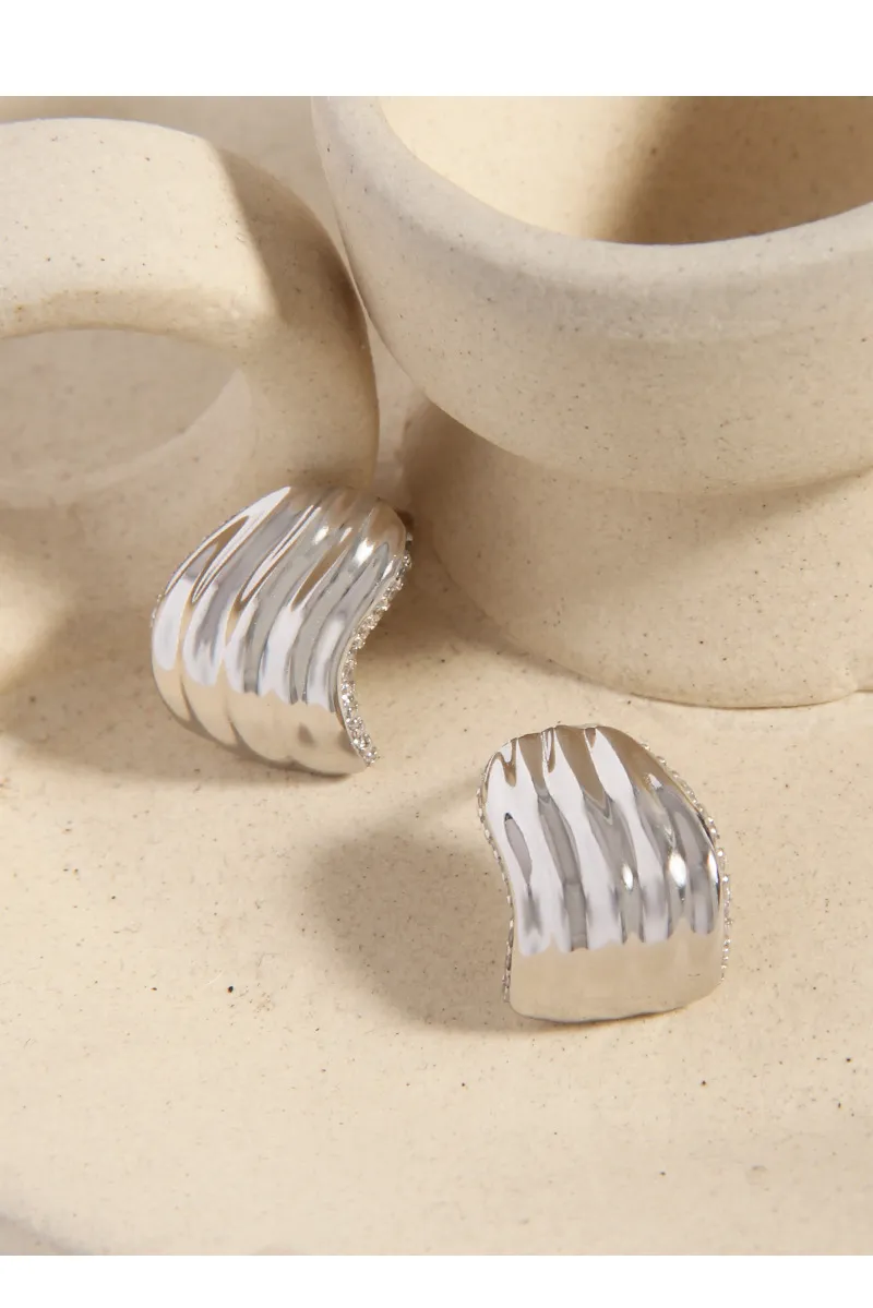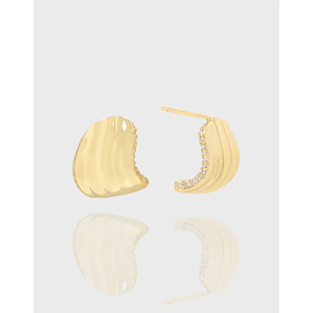 - Patterns or Textures: One side of the earring boasts delicate, undulating vertical ripples, reminiscent of ocean waves or natural shells, creating a rich texture. The opposing side is smooth and polished for a contrasting sleek finish. A line of sparkling pavé-set crystals adorns the inner curve, adding a radiant shimmer like the ‘celestial dance of light’.