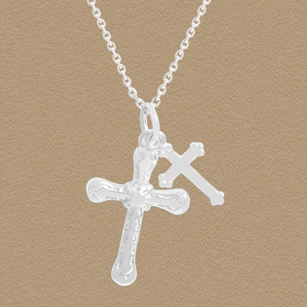 - Complementing the main pendant is a smaller, polished silver cross, featuring a smooth finish and distinctive rounded ends on each arm, offering a subtle contrast in style.
