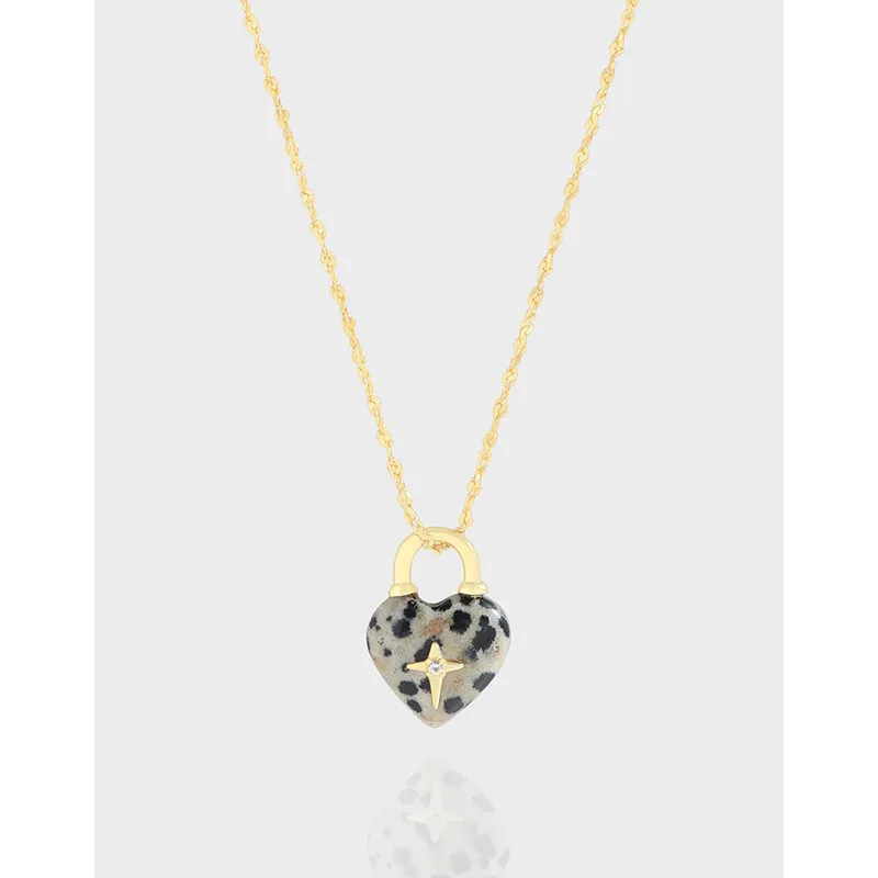 - Color: The delicate gold-toned twisted chain beautifully complements the heart-shaped pendant, crafted from a natural stone exhibiting warm grey and cream tones speckled with striking black spots. A brilliant clear star, possibly a tiny crystal or diamond, adorns its center.