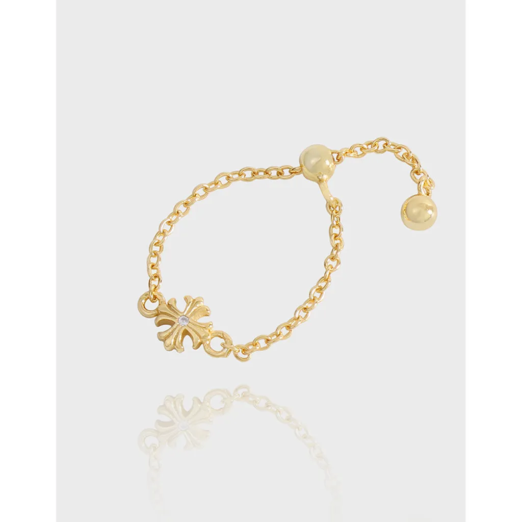 The ring showcases a fine, linked chain with a smooth and flexible texture, allowing for effortless movement. Central to the design is an intricately sculpted motif, reminiscent of a stylized cross or a blooming star, featuring subtle raised patterns and a polished finish. A single, sparkling clear gemstone is meticulously set at its core, providing a brilliant focal point. The adjustable mechanism is finished with sleek, spherical beads, adding a touch of smooth, polished texture.