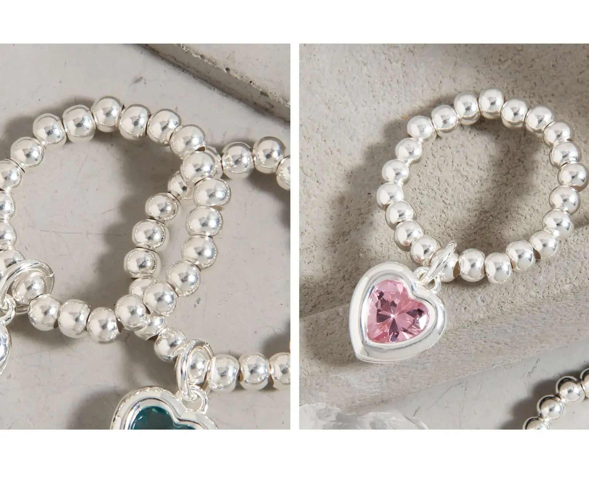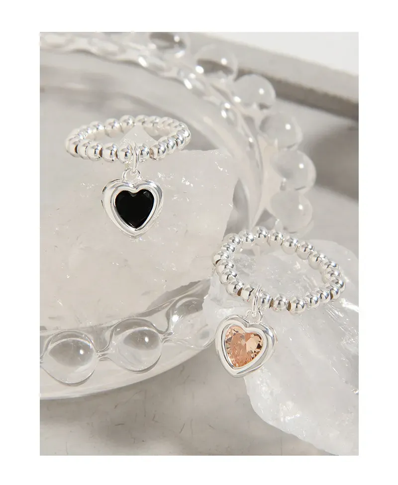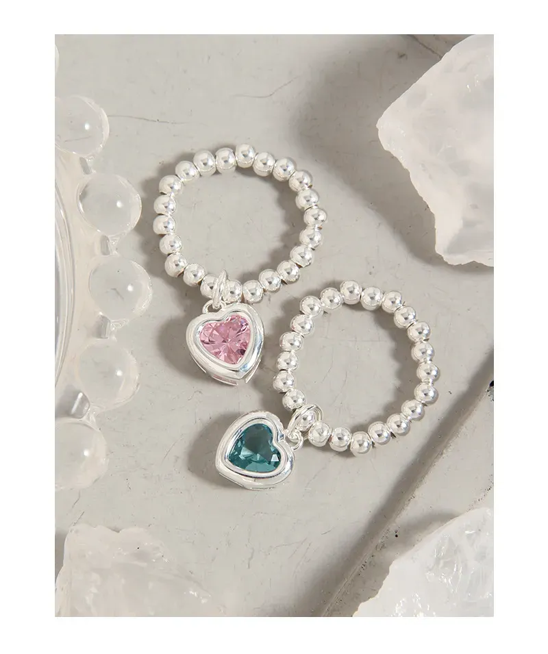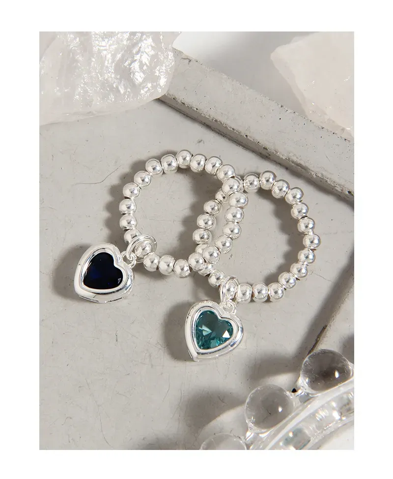 - Patterns & Textures: The ring band is crafted from numerous small, uniformly polished spherical silver beads, creating a smooth, tactile texture that adapts gracefully. Each central heart charm features a brilliantly faceted gemstone nestled within a sleek, polished silver bezel, offering a captivating shimmer and depth inspired by the natural elements.