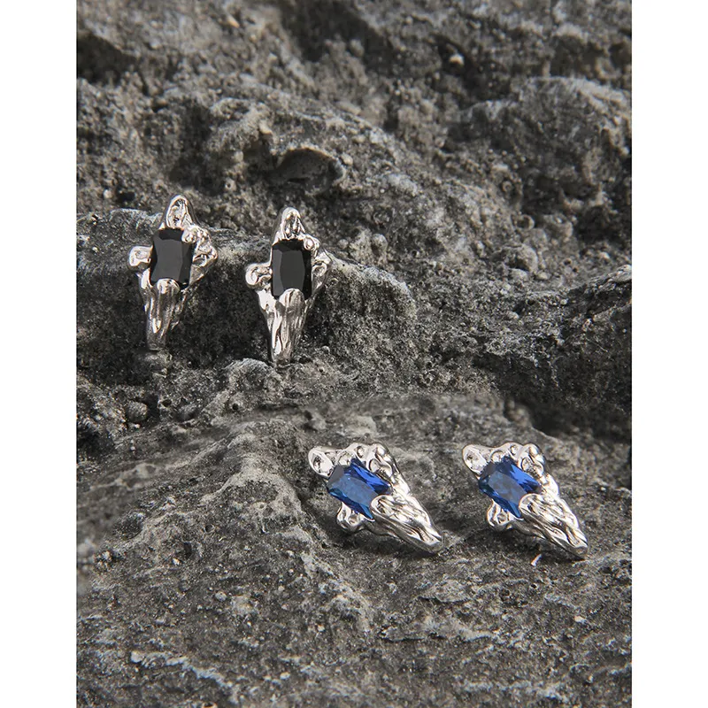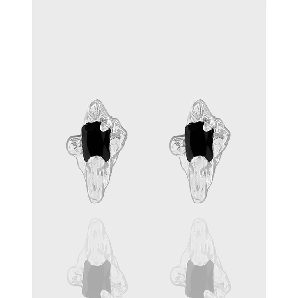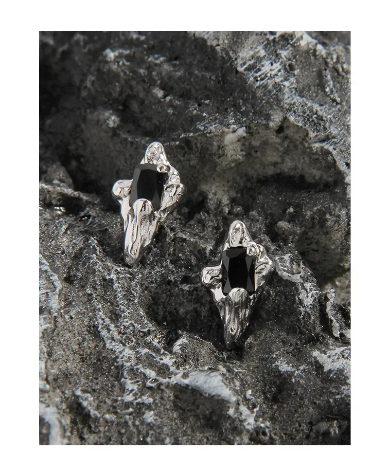 • Patterns & Textures: The silver features a distinctive, raw textured finish, reminiscent of molten metal or naturally eroded forms. This unique, irregular surface beautifully contrasts with the smooth, precisely cut rectangular black stone, creating an intriguing interplay of organic and refined elements.