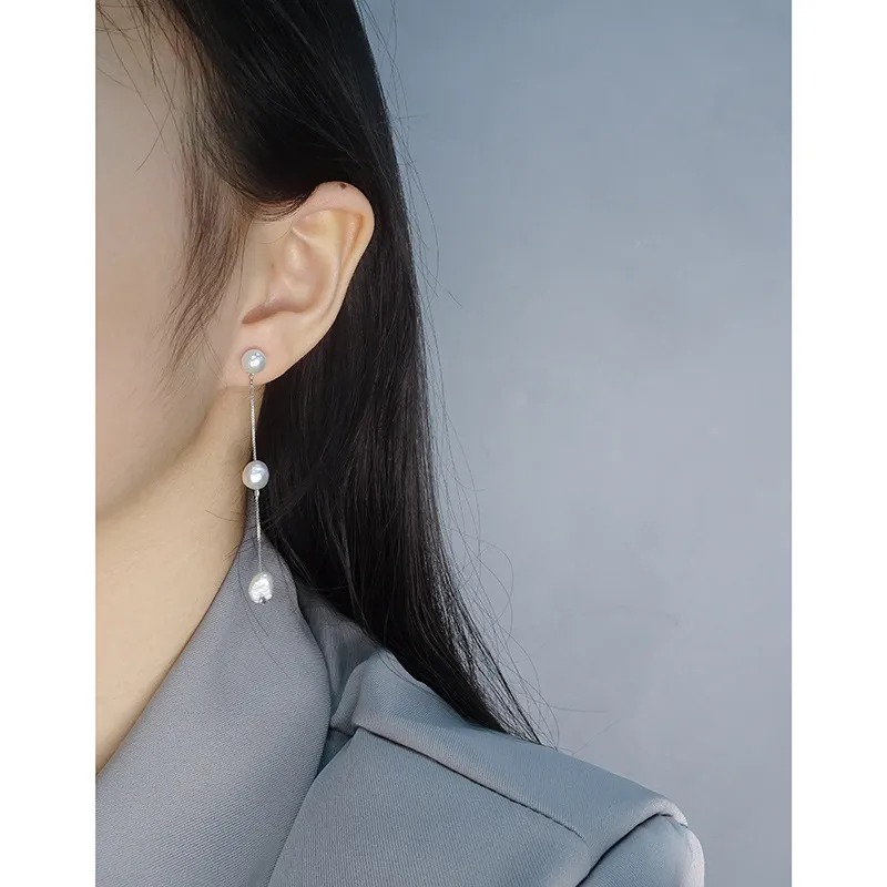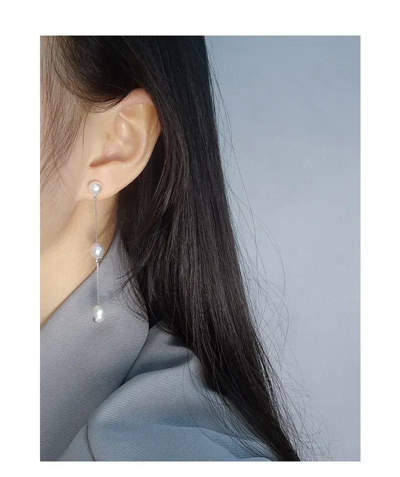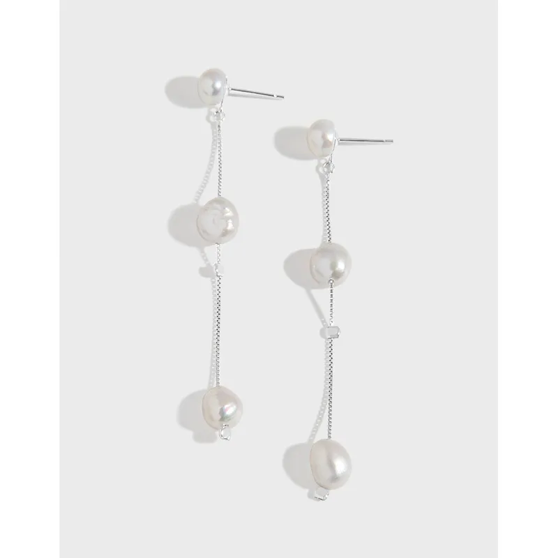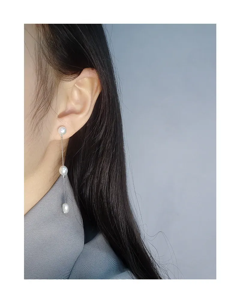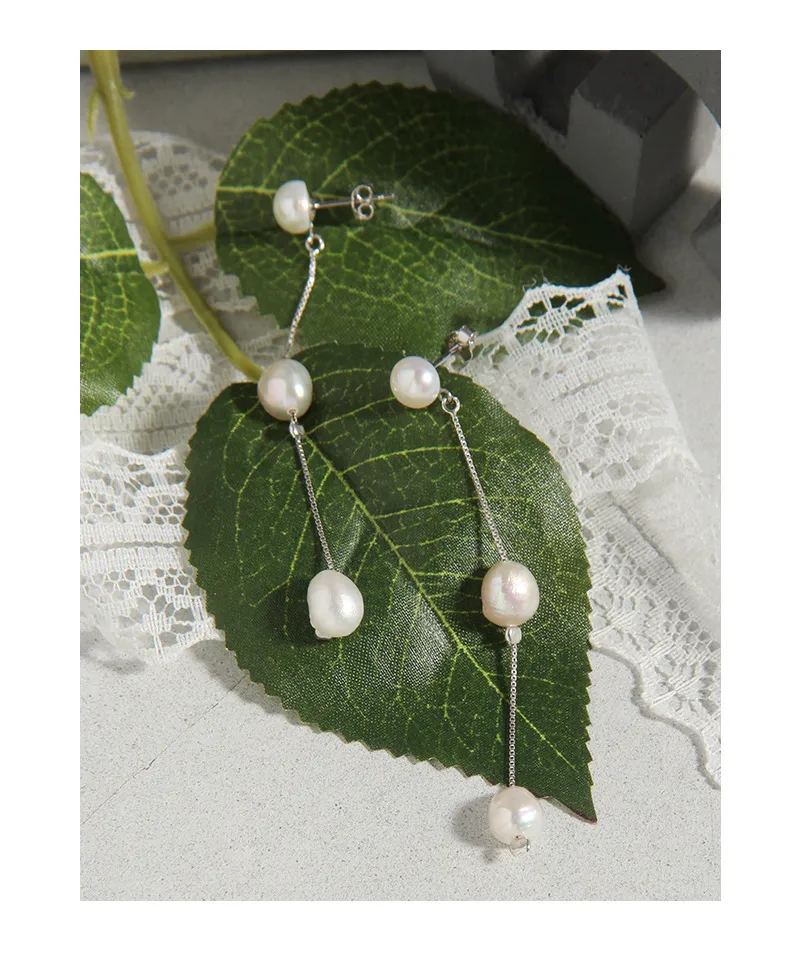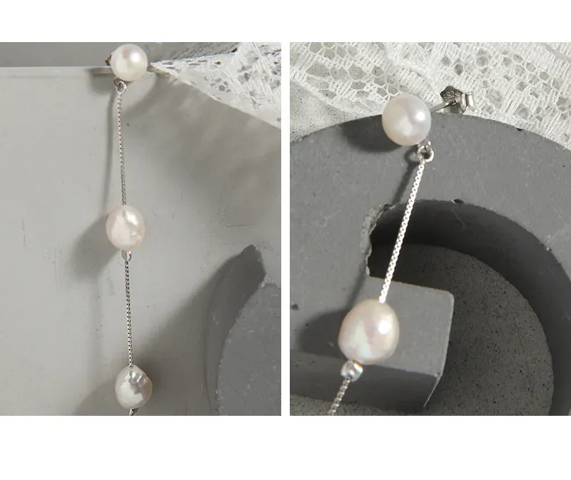 - Patterns & Textures: Celebrating nature’s imperfect beauty, each pearl possesses a unique, organic, slightly irregular shape and a smooth, radiant surface. The delicate sterling silver box chain provides a subtle metallic texture and is intermittently accented with small silver beads, enhancing the pearls’ natural glow.