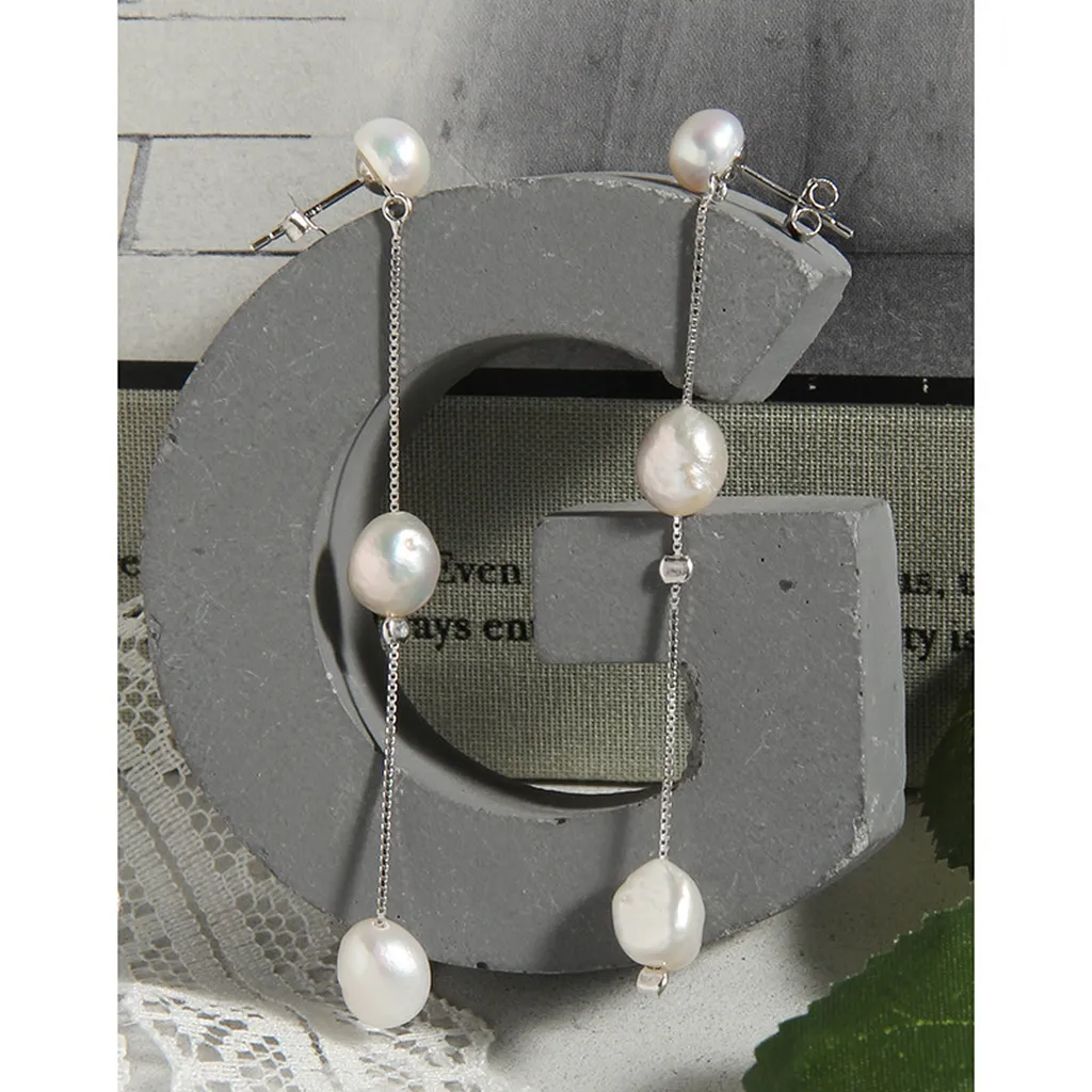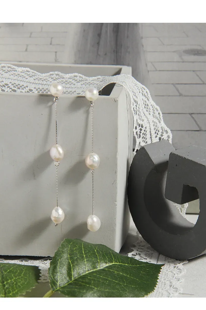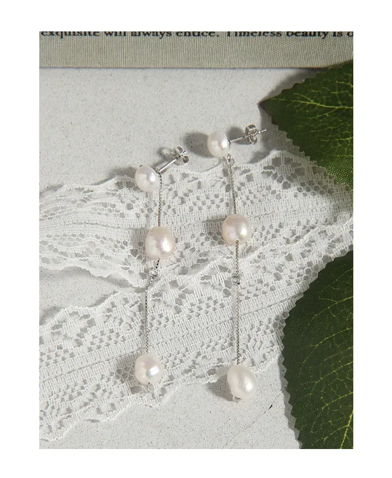 - Color: Adorned with lustrous, creamy white freshwater pearls that display a captivating iridescence, beautifully complemented by the polished gleam of sterling silver chains and delicate components.