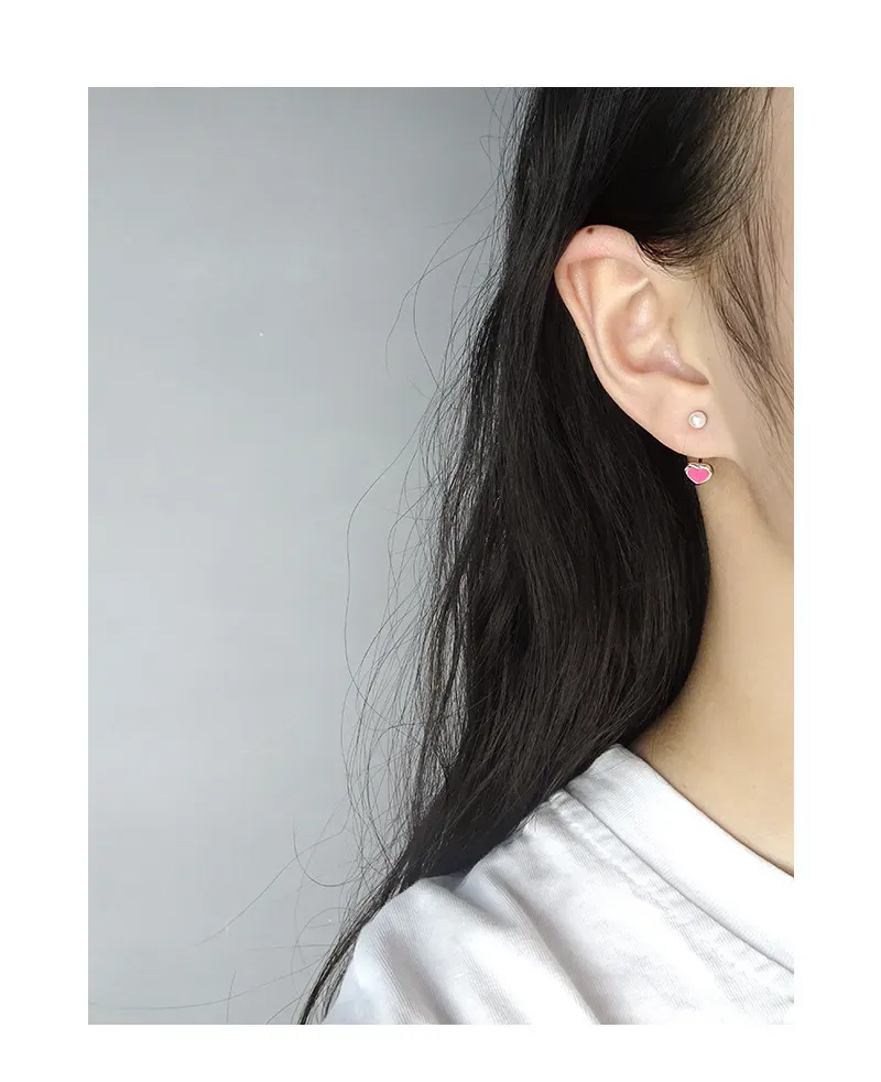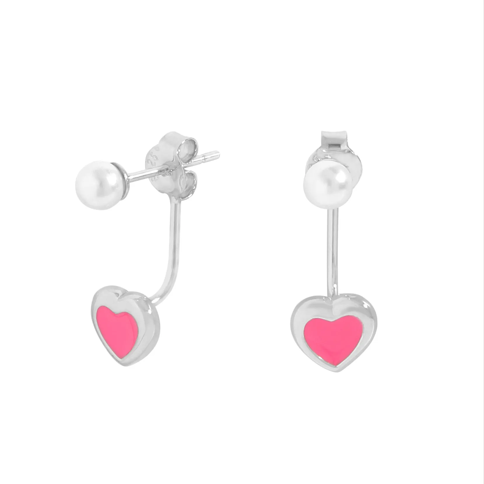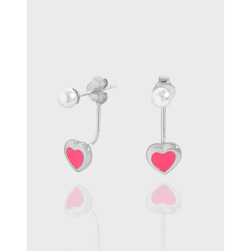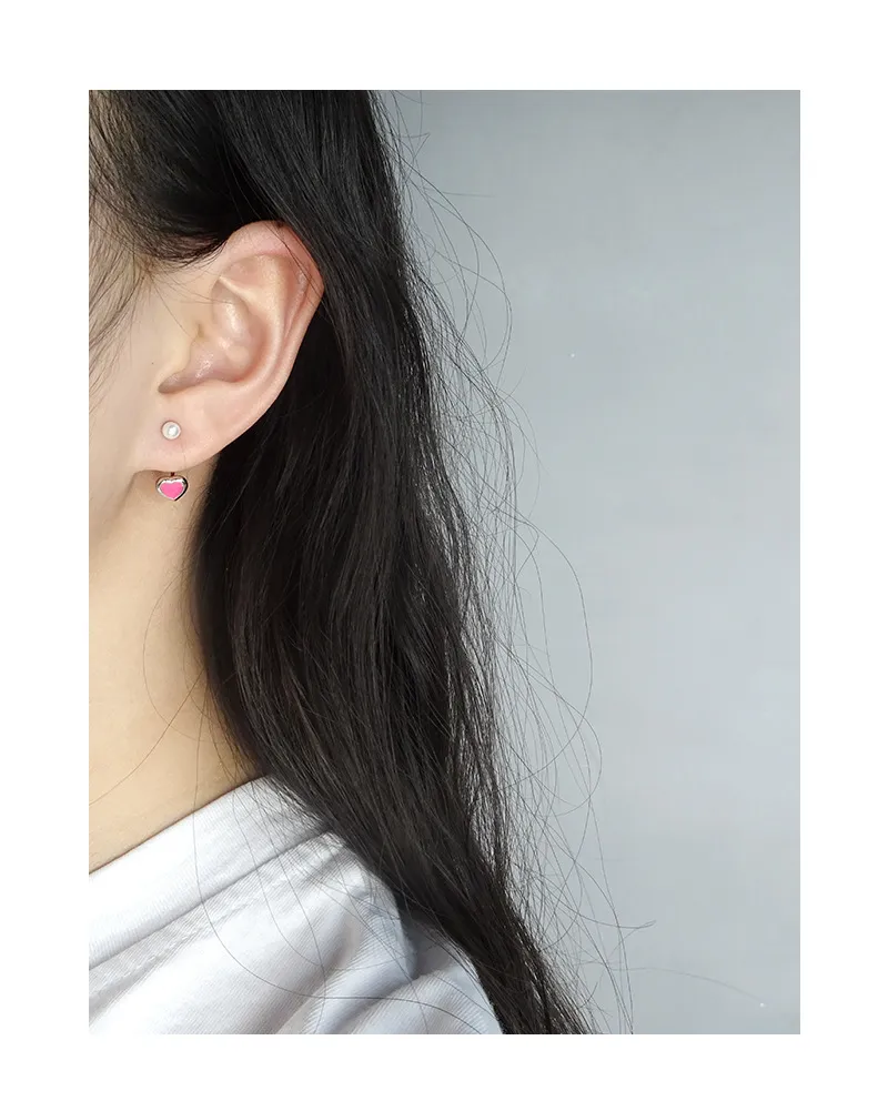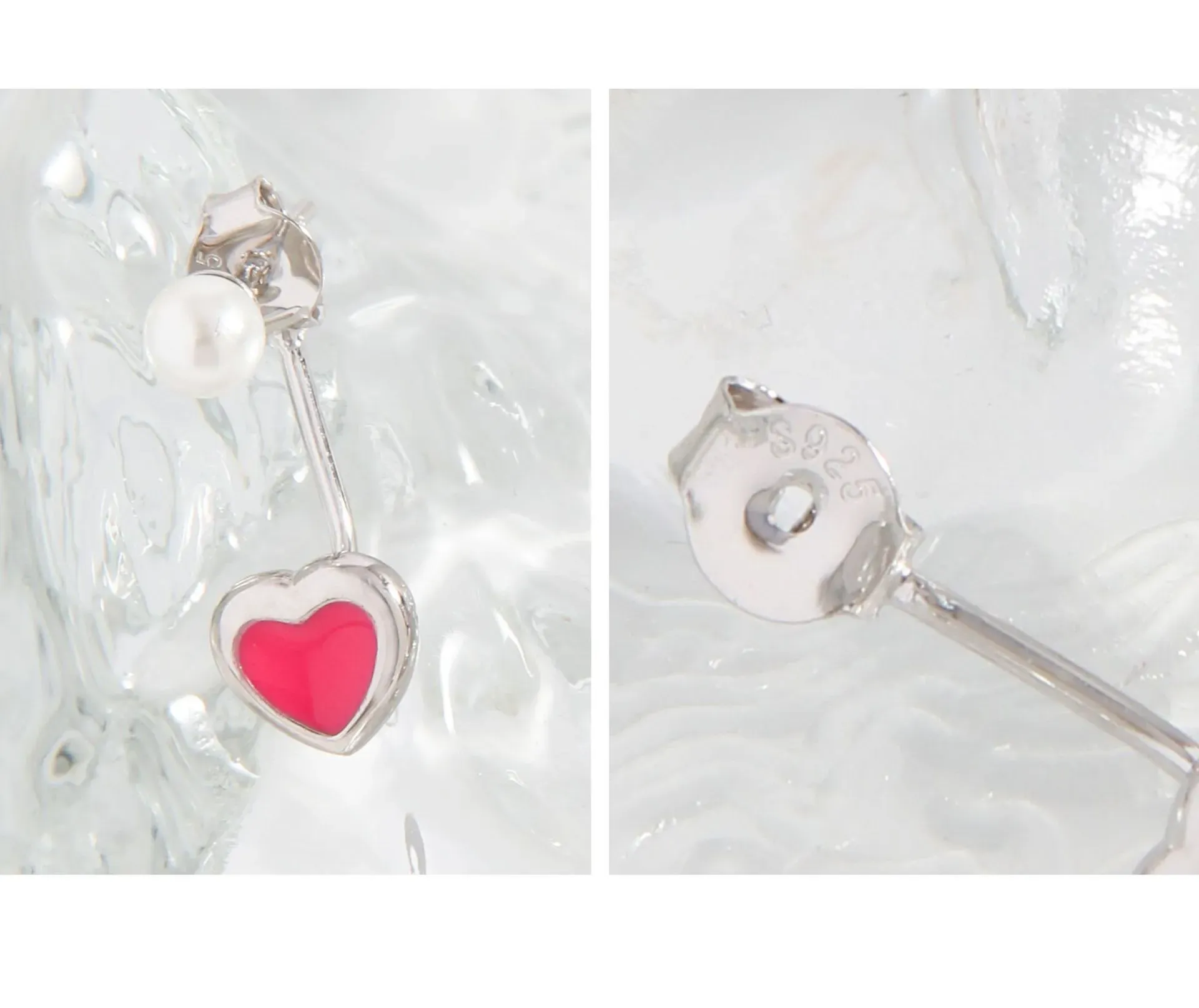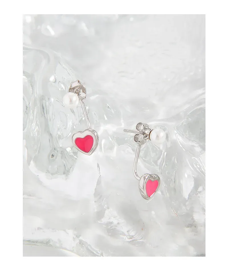 - Color: Each earring showcases a luminous white pearl stud, beautifully complemented by a vibrant hot pink enamel heart, all crafted in polished silver-toned metal.