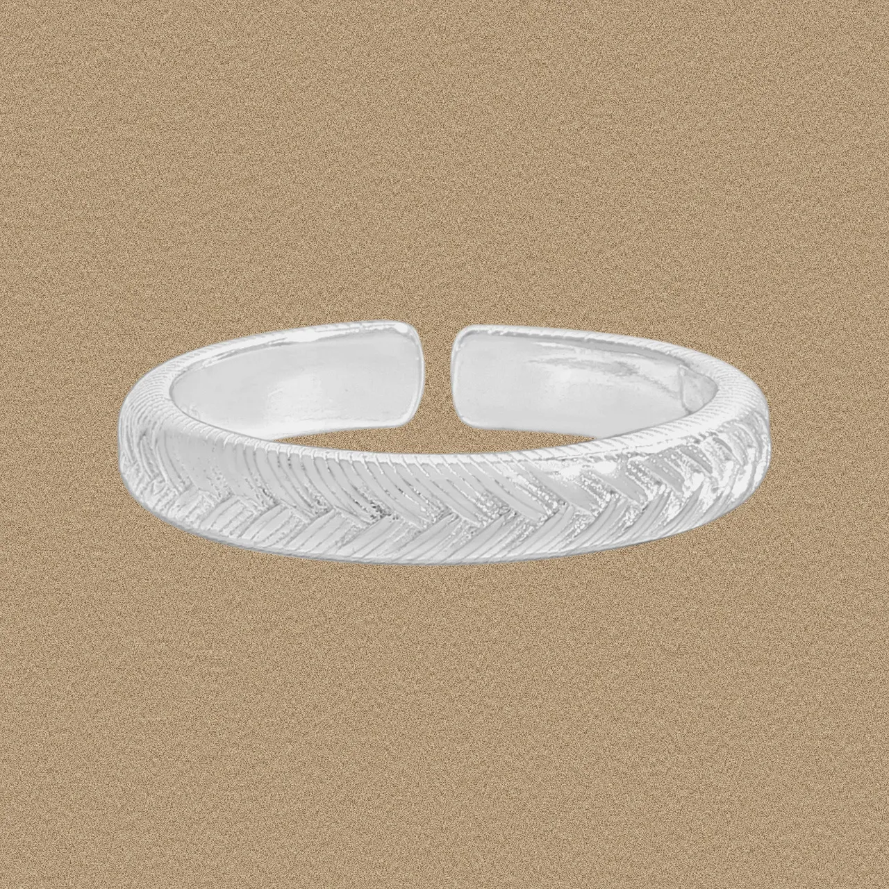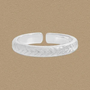 The distinctive design features an intricate, raw texture reminiscent of nature’s artistry. The entire band is adorned with a meticulously crafted braided pattern, evoking the timeless beauty of woven elements. This unique texture adds depth and character, transforming the ring into an ode to the imperfect beauty of the natural world.