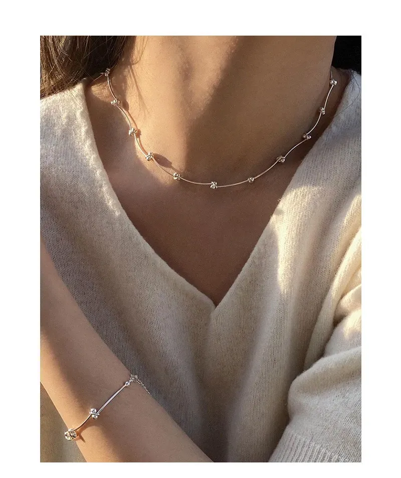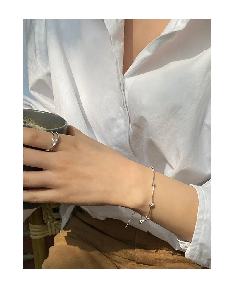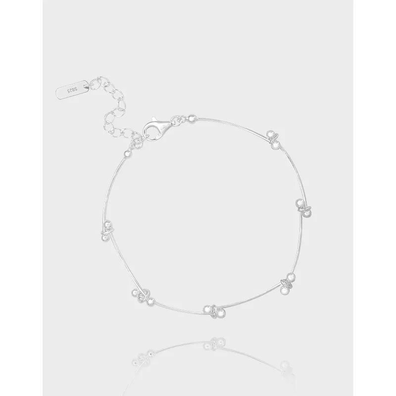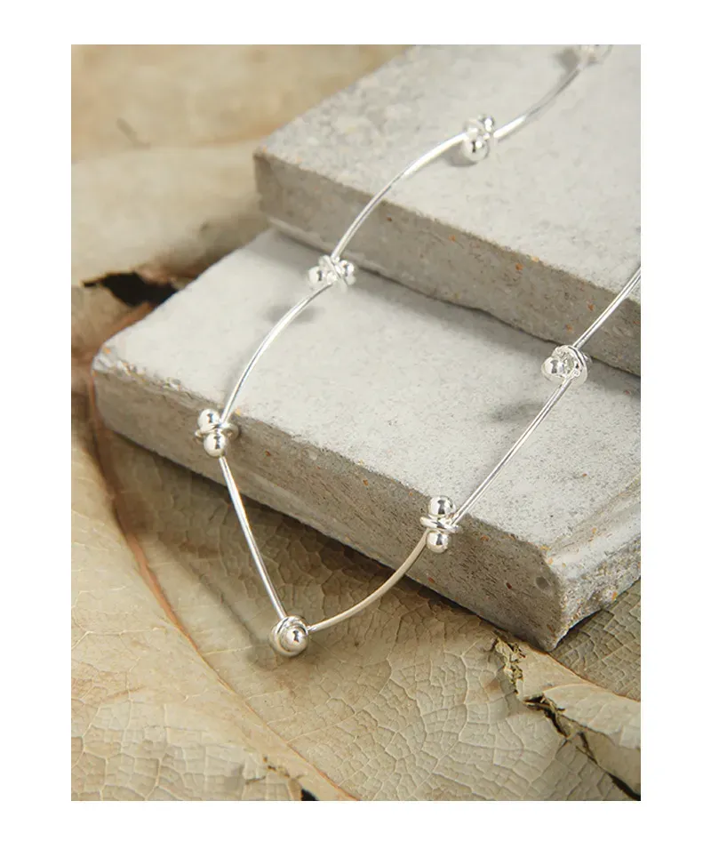 • Patterns & Textures: The bracelet boasts a smooth, highly polished surface throughout, ensuring a lustrous finish that catches the light beautifully. Along its slender form, evenly spaced clusters of two small, perfectly spherical beads create a unique, knot-like pattern, adding a refined texture and visual interest without intricate detailing.