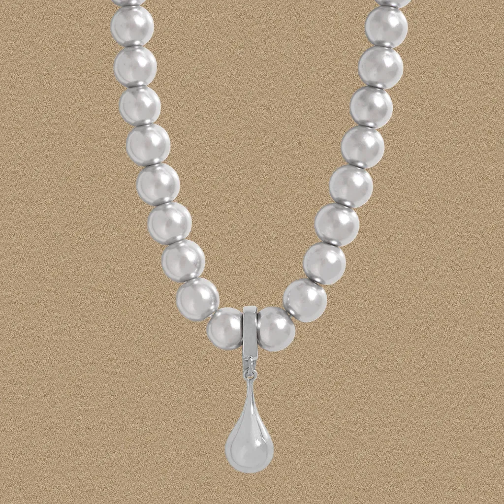 - Textures & Patterns: The pearls boast a smooth, highly polished surface, reflecting light with a subtle sheen. The sophisticated teardrop pendant, crafted from gleaming silver, features an equally smooth and reflective finish, embodying a fluid, natural form.