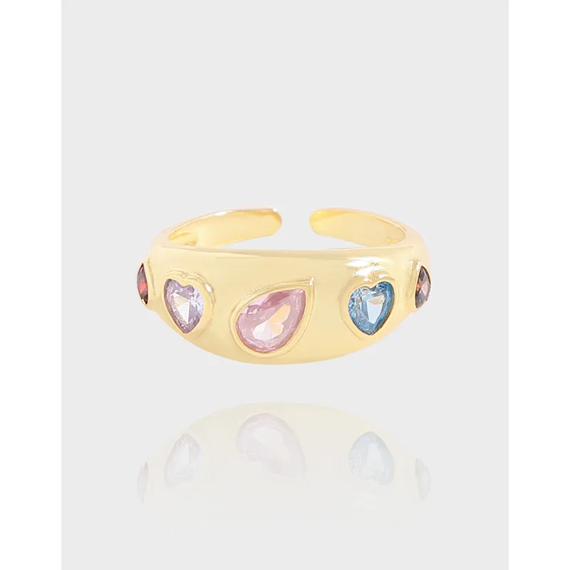 - Color: The polished gold band provides a luminous base for an array of vibrant gemstones. Adorning the Rhysella Ring are five distinct stones in celestial hues: a delicate light purple heart, a charming light pink pear-shaped gem, a serene light blue heart, and two deeper-toned round gems in shades of rich red and warm brown. This playful palette captures the ethereal glow of the aurora borealis, a core inspiration for Malisse.