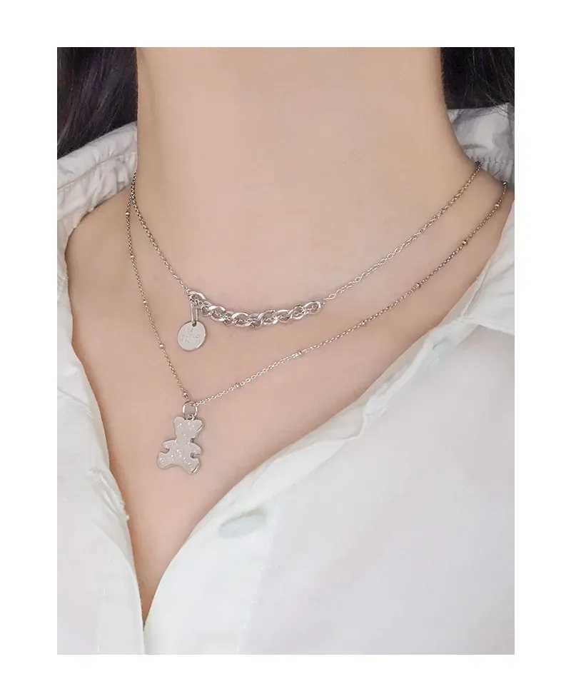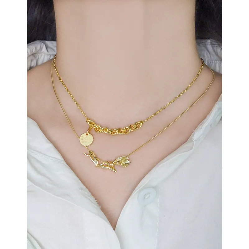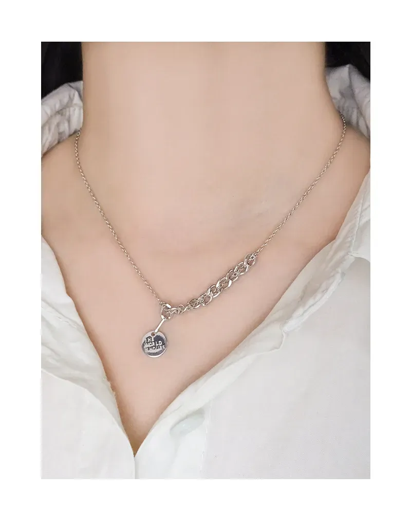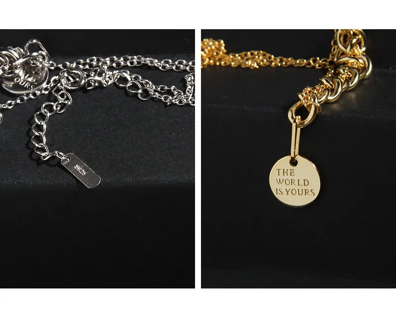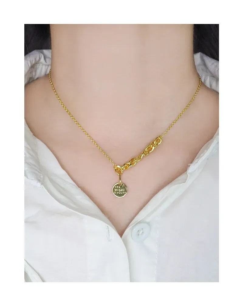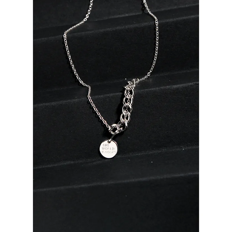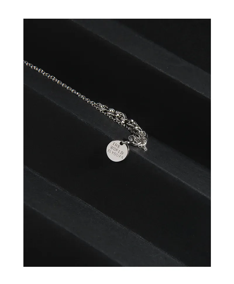 - Patterns & Textures: The chains boast a smooth, highly polished finish, creating a lustrous and reflective surface. Adorning the bolder chain segment is a circular disc charm, also with a smooth, polished texture, elegantly engraved with the empowering phrase “THE WORLD IS YOURS.”
