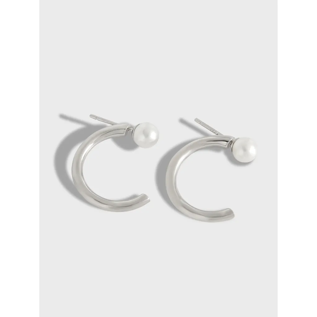 Each earring is adorned with a smooth, radiant white pearl, elegantly positioned at the top of the curve. The polished metal provides a luminous backdrop, highlighting the pearl’s natural shimmer. Their minimalist yet captivating design embodies a delicate balance of modern elegance and organic charm, echoing the timeless allure of nature’s artistry.