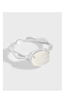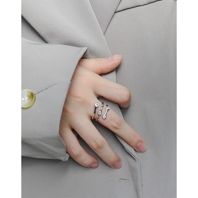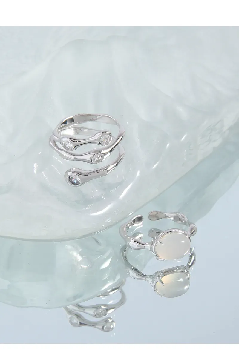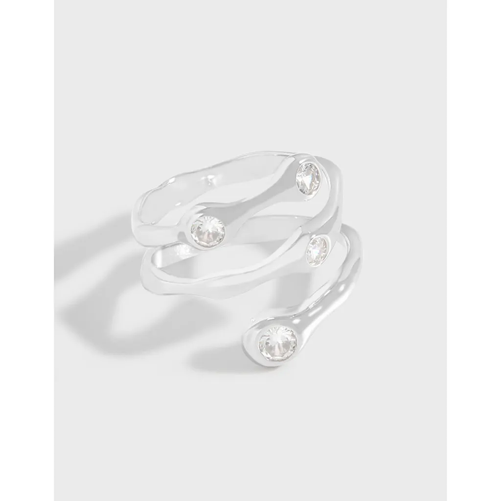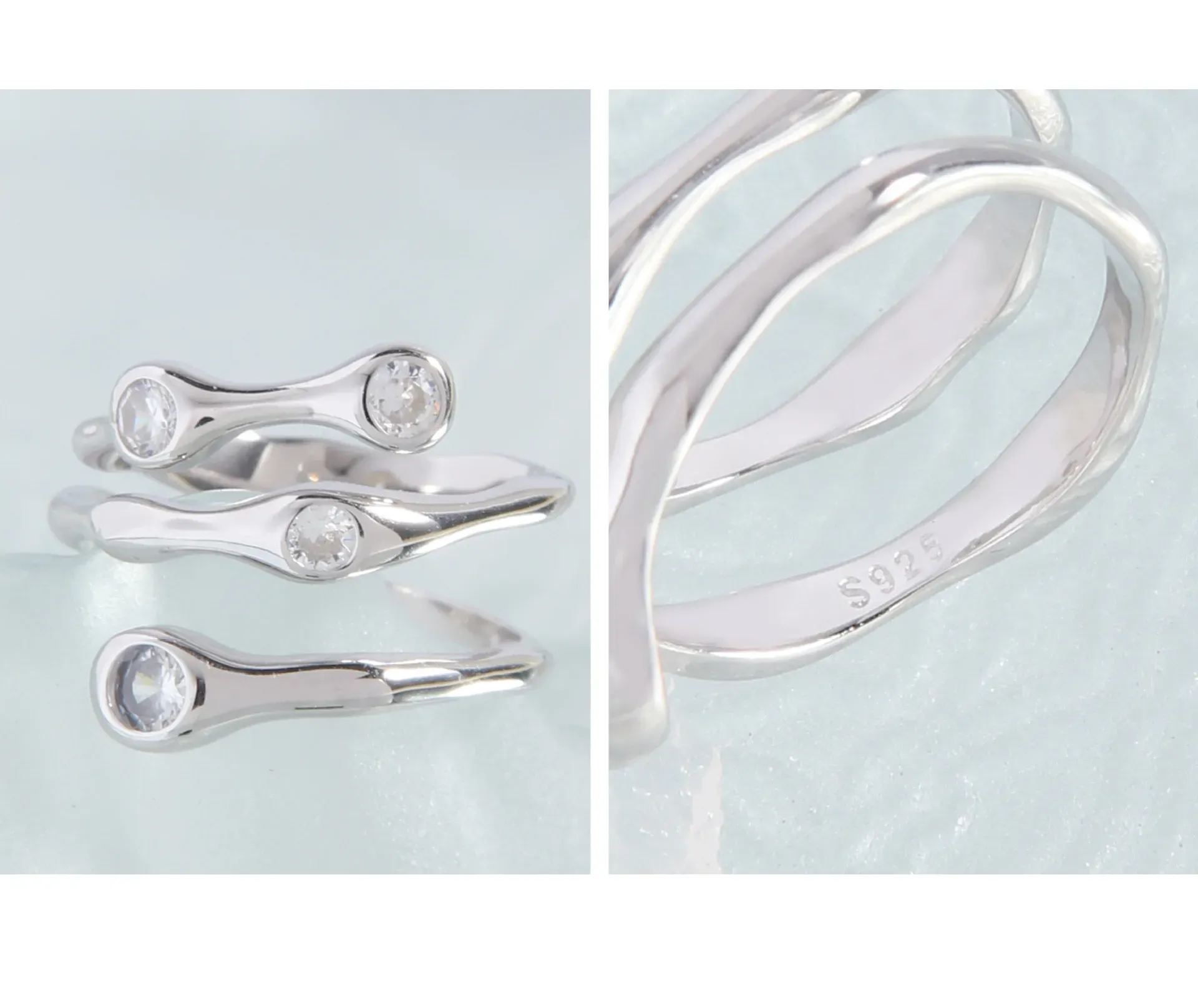 - Patterns & Textures: The band features an organic, fluid, and slightly irregular texture, giving it a handcrafted, natural feel. Five brilliant, round-cut stones are bezel-set at various points along the wavy band, providing dazzling sparkle and a celestial touch that beautifully contrasts with the silver’s smooth undulations.