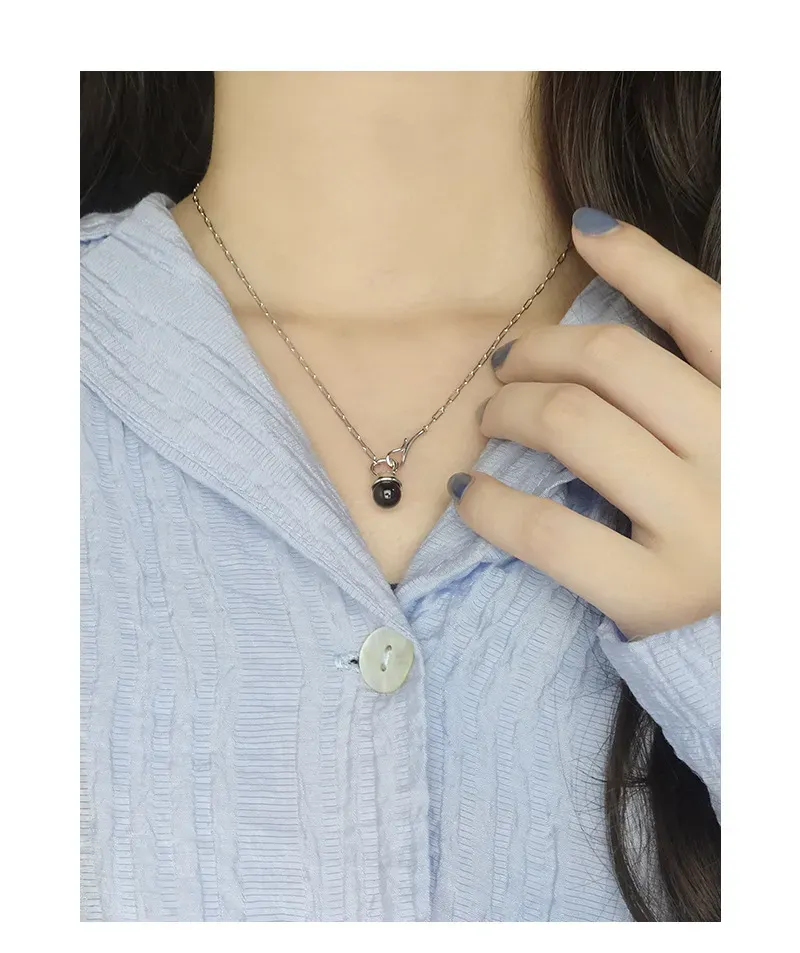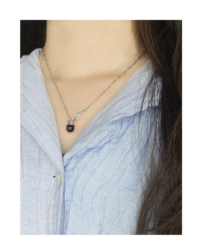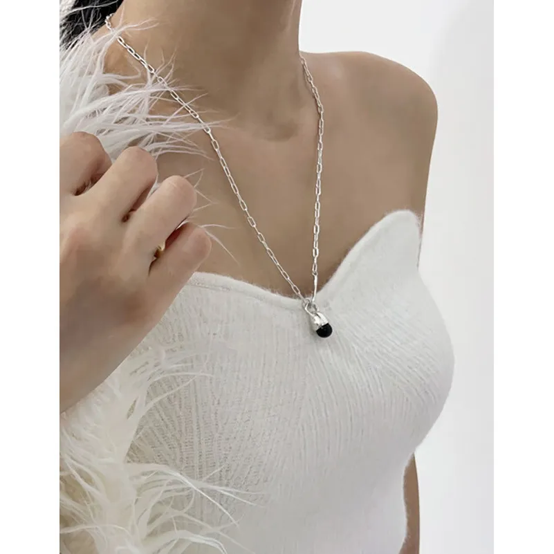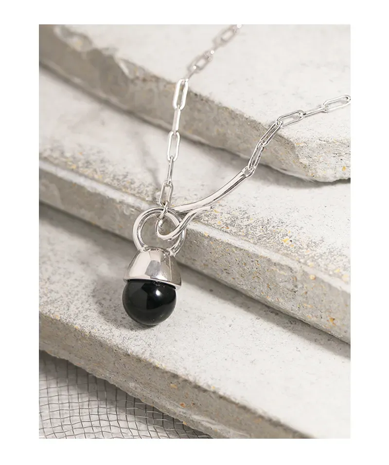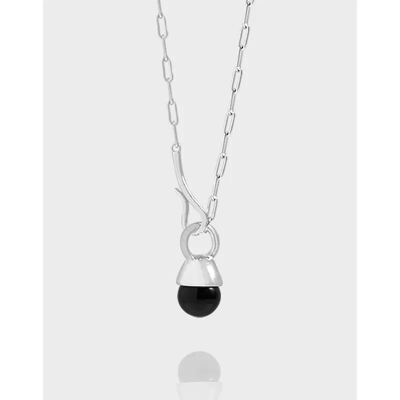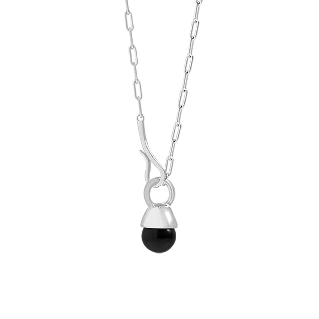 - Patterns & Textures: The delicate, elongated links of the paperclip chain create a subtle, repetitive pattern with a smooth, reflective texture. The silver components boast a high-polish finish, while the pendant features a perfectly smooth, dome-shaped black onyx, exuding a luxurious, deep texture and a captivating, understated sheen.