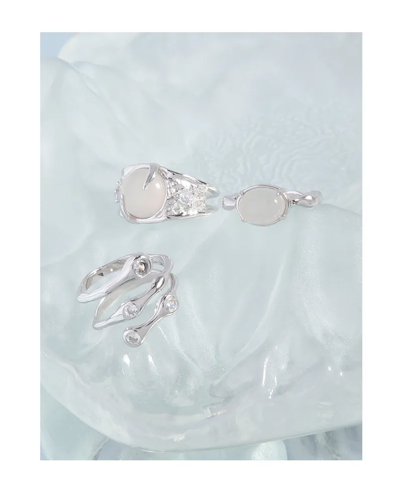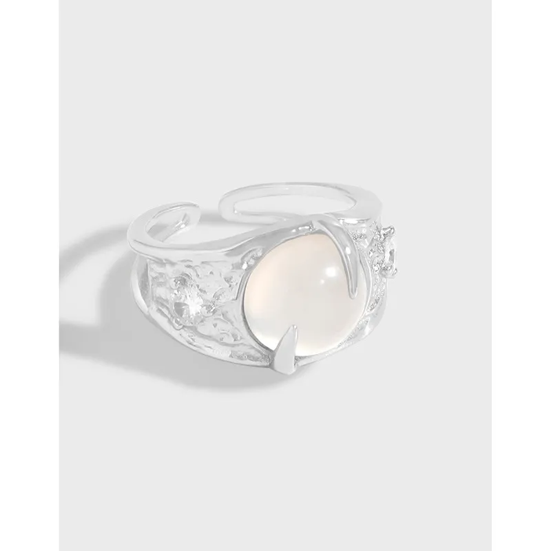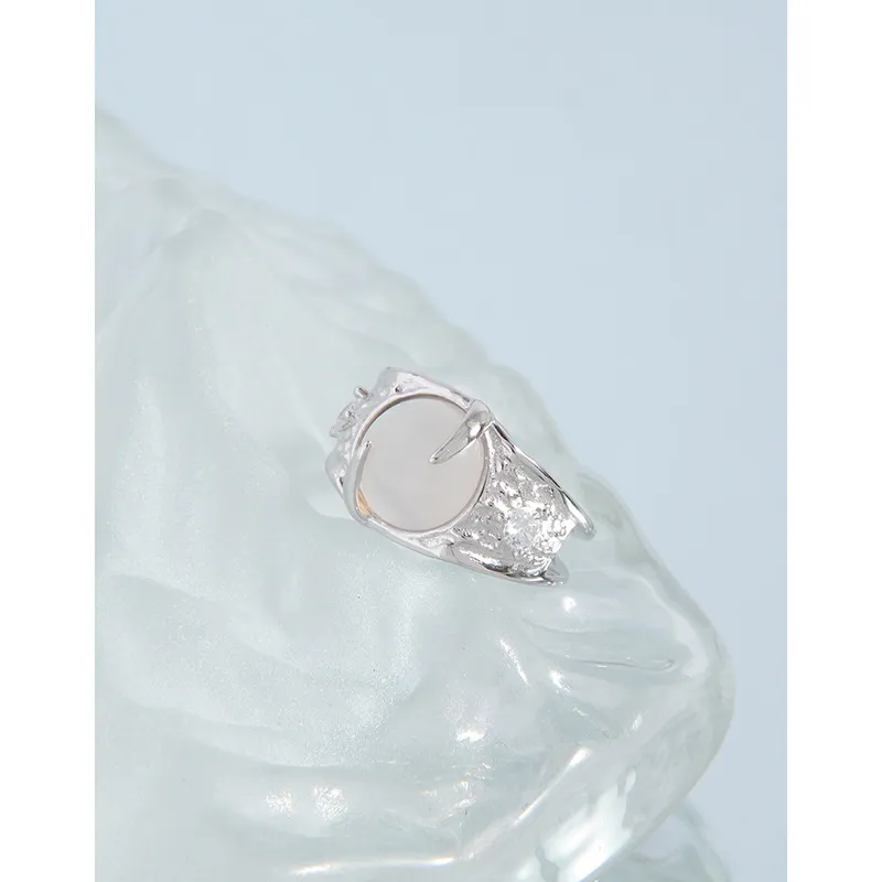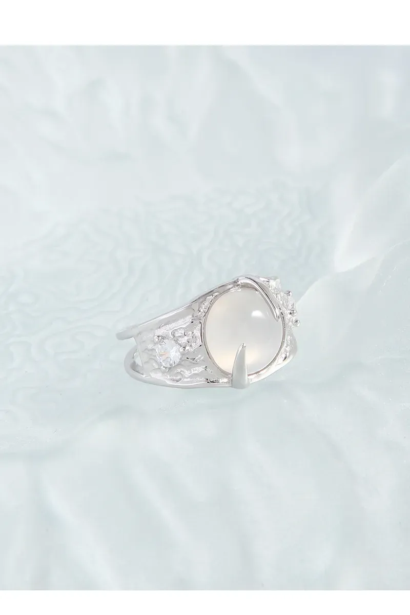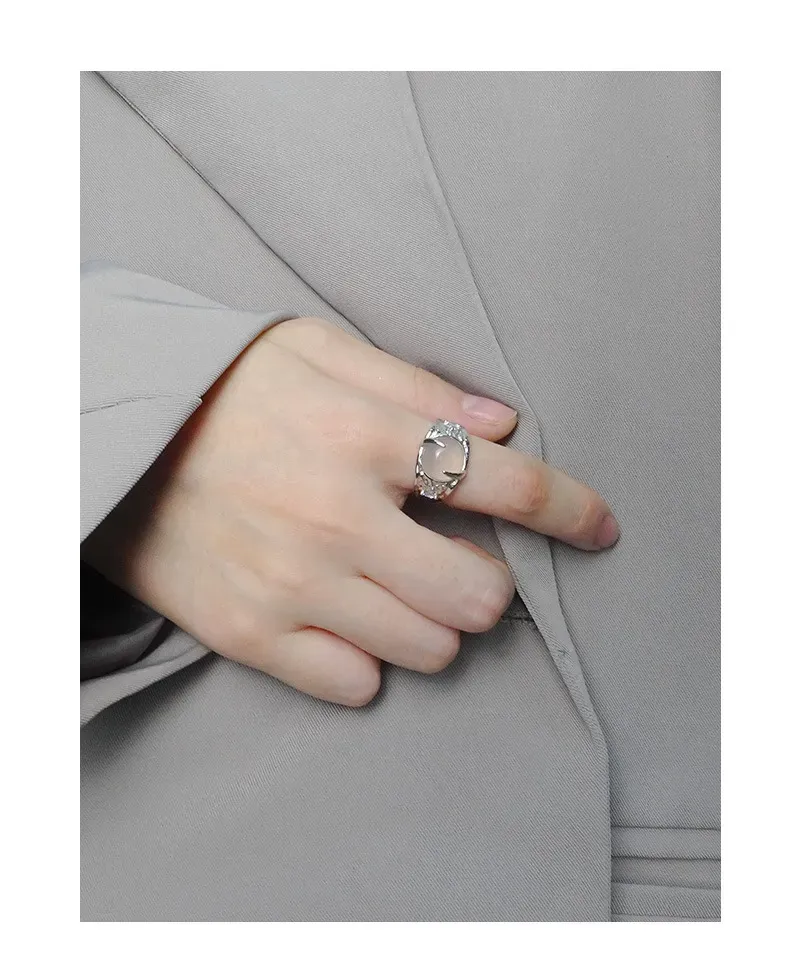 - Color: Crafted from lustrous silver, the band beautifully complements the milky white, opalescent central stone. Small, sparkling accents are subtly embedded, adding a touch of celestial shimmer.
