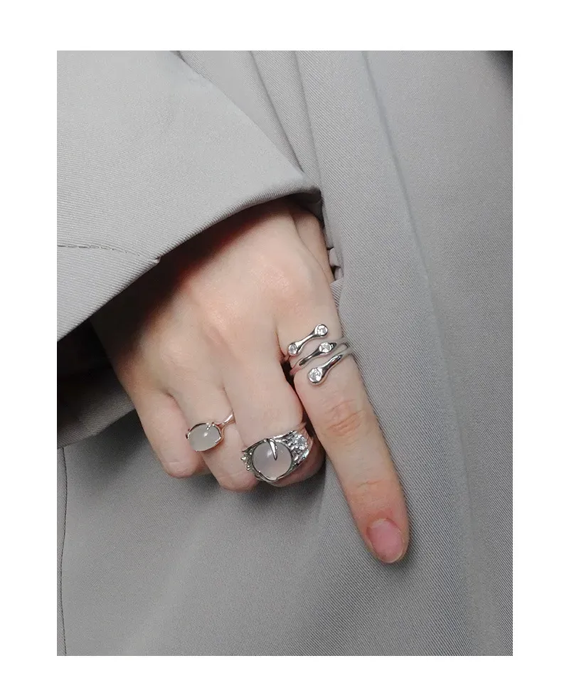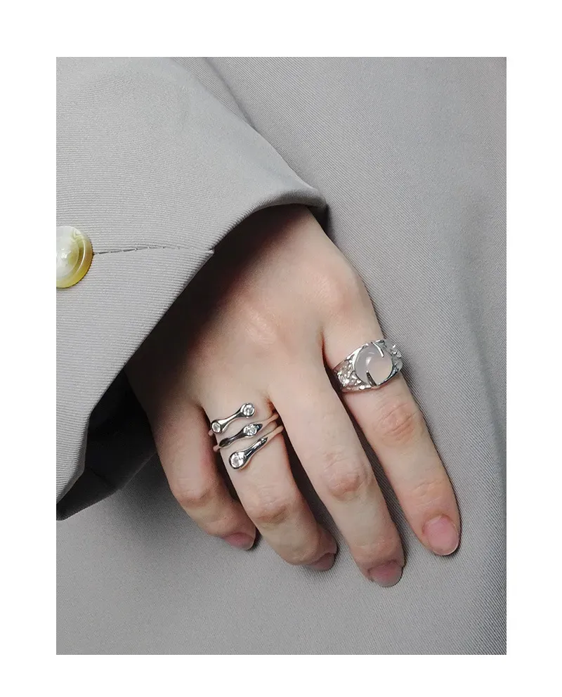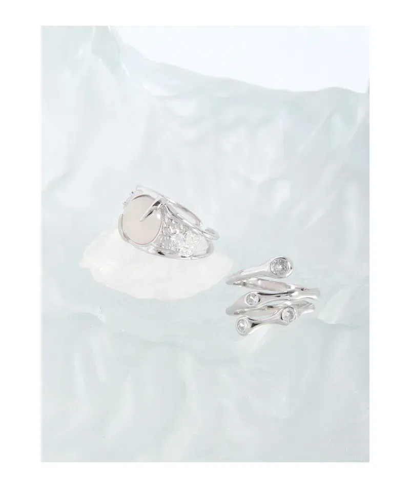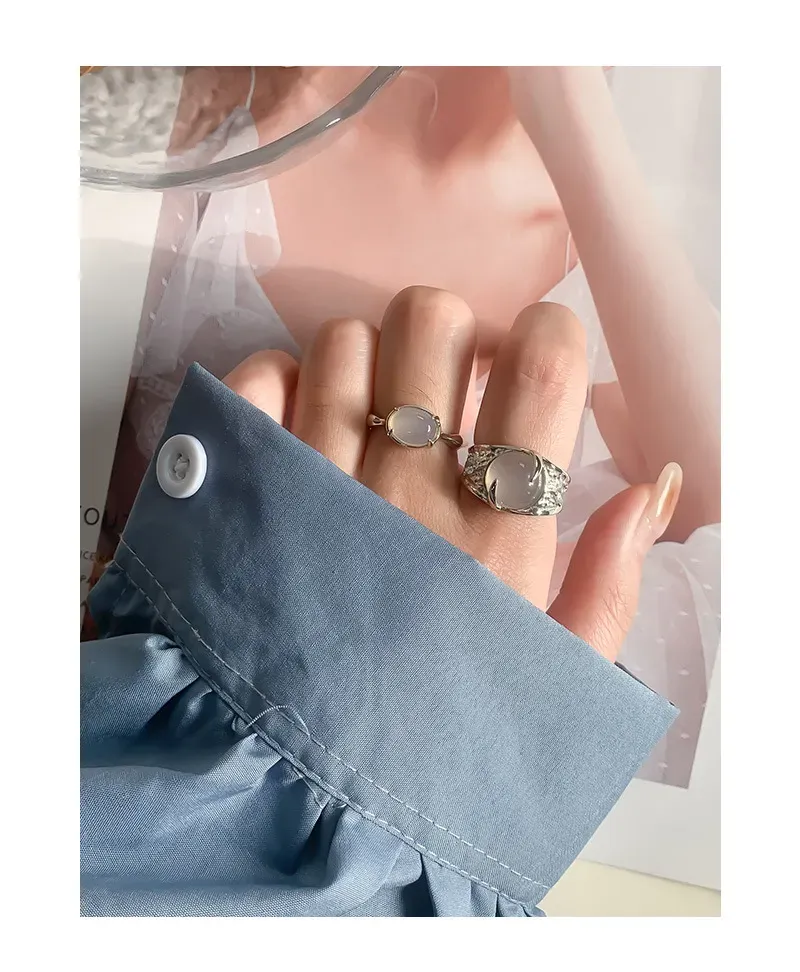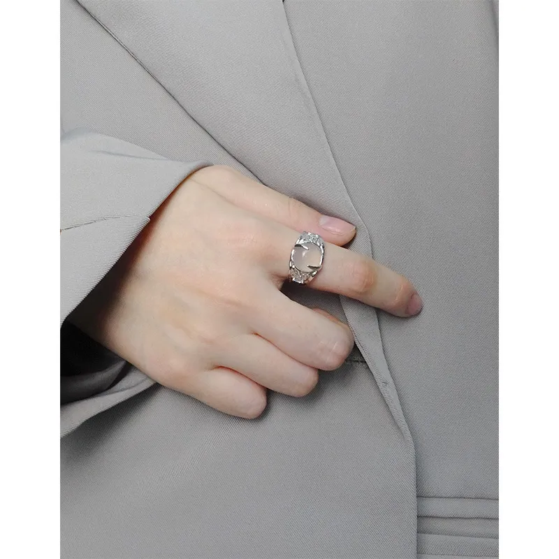 - Color: Crafted from lustrous silver, the band beautifully complements the milky white, opalescent central stone. Small, sparkling accents are subtly embedded, adding a touch of celestial shimmer.