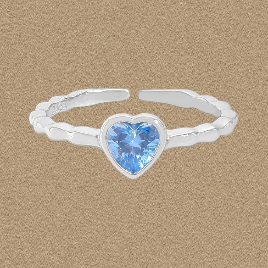 - Color: This exquisite Saenith Ring features a brilliant heart-shaped blue gemstone, radiating a captivating azure hue that beautifully complements the lustrous silver-toned band.