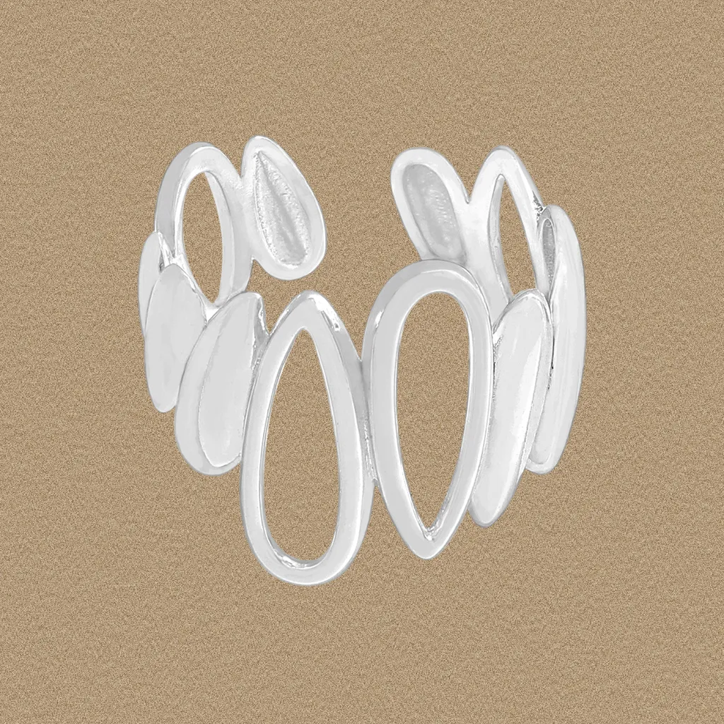 The ring features an elegant open-ended bypass style, designed with interlocking, open teardrop-shaped elements. Its fluid, sweeping lines evoke the delicate movement of water or wind, creating a modern and sculptural statement piece that feels both luxurious and organically inspired.