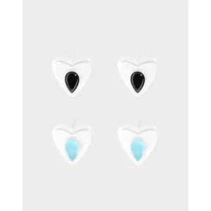 - Patterns or Textures: Adorned with a lustrous, smooth metallic finish, the heart frame perfectly encases a central teardrop-shaped element. The black stone boasts a uniformly sleek and opaque surface, offering sophisticated simplicity. The celestial blue stone, conversely, reveals a subtle, translucent texture, evocative of the natural variations found in gemstones and the ethereal glow of light, echoing Malisse’s appreciation for raw textures and nature’s imperfect beauty.