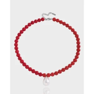 This striking Sansica Necklace features a continuous strand of smooth, polished red coral beads, each sphere boasting a rich, uniform hue that evokes the depth of natural gemstones. The brilliance of these beads is beautifully contrasted by a single, lustrous teardrop pearl, suspended gracefully at the center. The pearl’s inherent shimmer and unique, fluid shape celebrate the imperfect beauty of nature’s patterns, making each piece a delicate balance of earth’s elements.