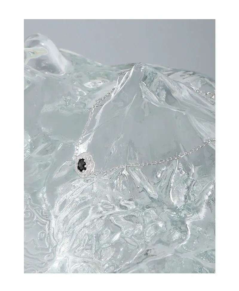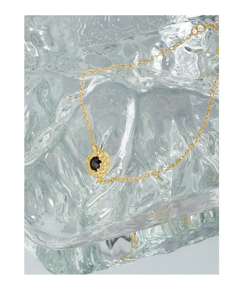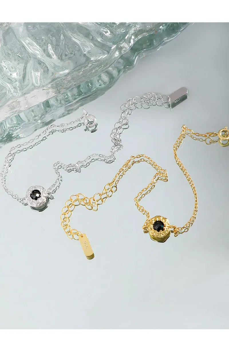 Patterns or Textures: The fine, flat oval links of the chain offer a subtle texture, leading to a unique central charm. This charm boasts an organic, raw, and wonderfully imperfect hammered texture, reminiscent of natural formations or molten elements. Nestled within this textured setting is a smooth, polished round black gemstone, providing a striking contrast and depth, evoking the mystery of the night sky.