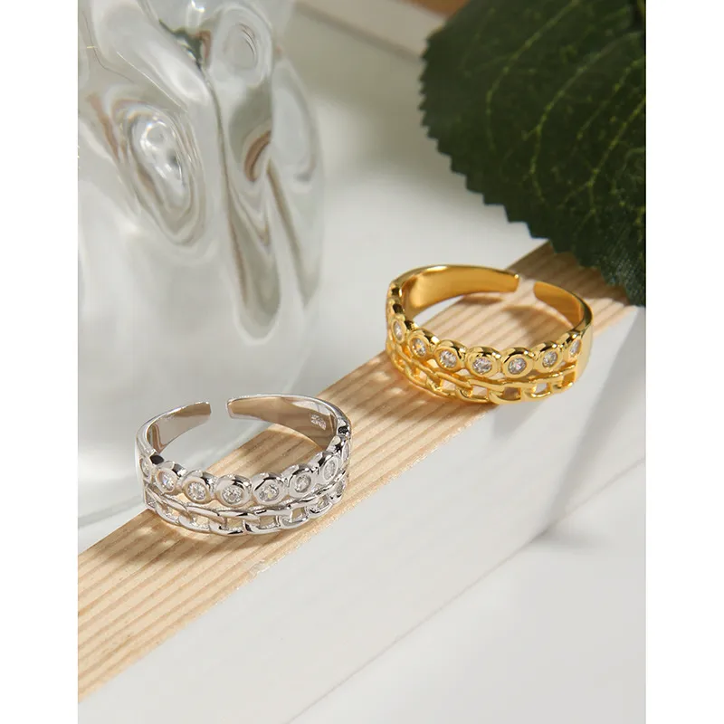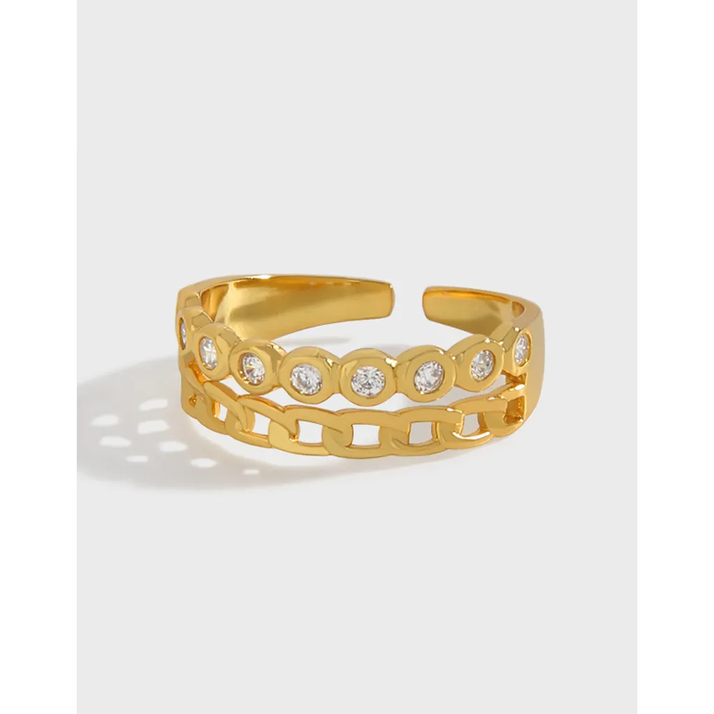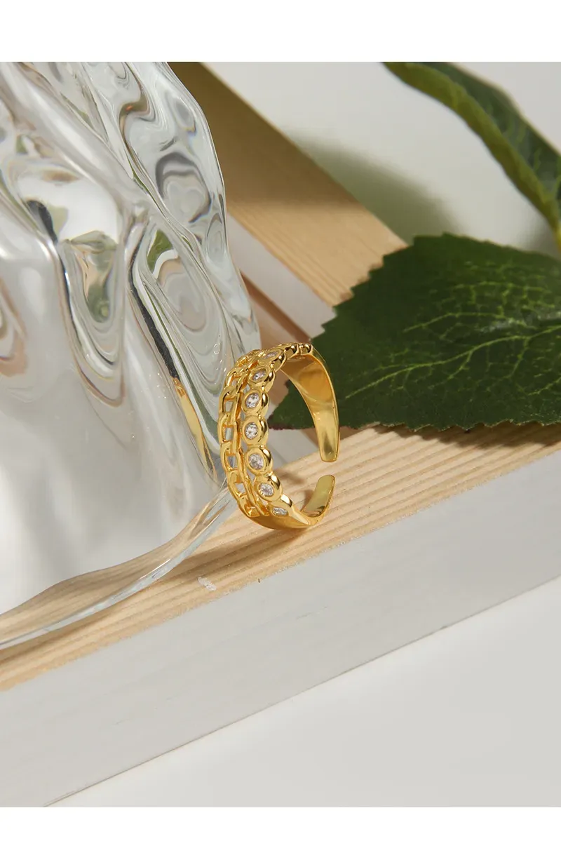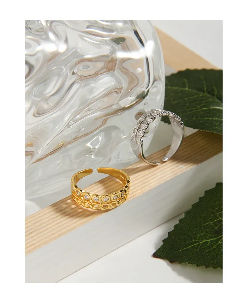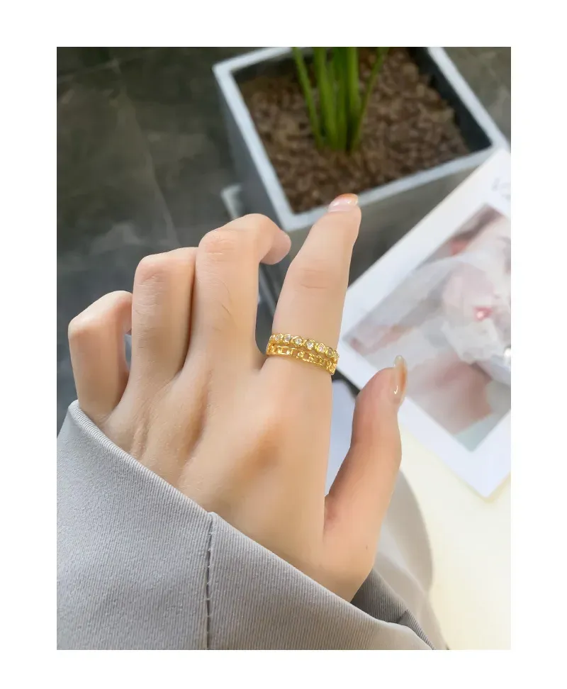 - Style: This adjustable ring features a modern, dual-layered design that offers a chic and elegant statement. Its open silhouette embodies a fluid and organic aesthetic, capturing the dynamic essence of nature’s artistry.