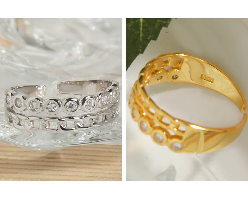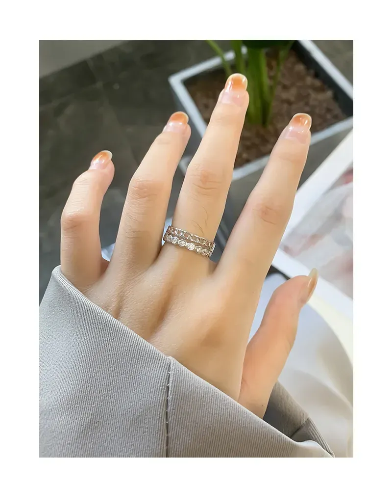 - Patterns & Textures: The top band showcases a series of round, sparkling white stones, individually bezel-set, creating a luminous, dotted pattern that mimics the subtle twinkle of stars. Below, the second band presents a smooth, polished chain-link texture, offering a harmonious balance of refined fluidity and unique detail.
