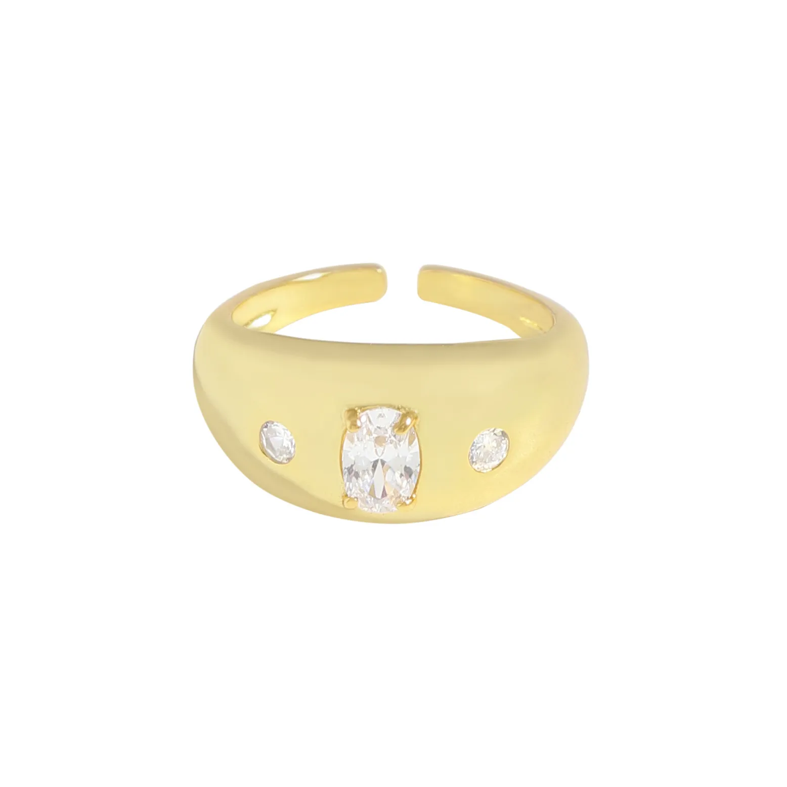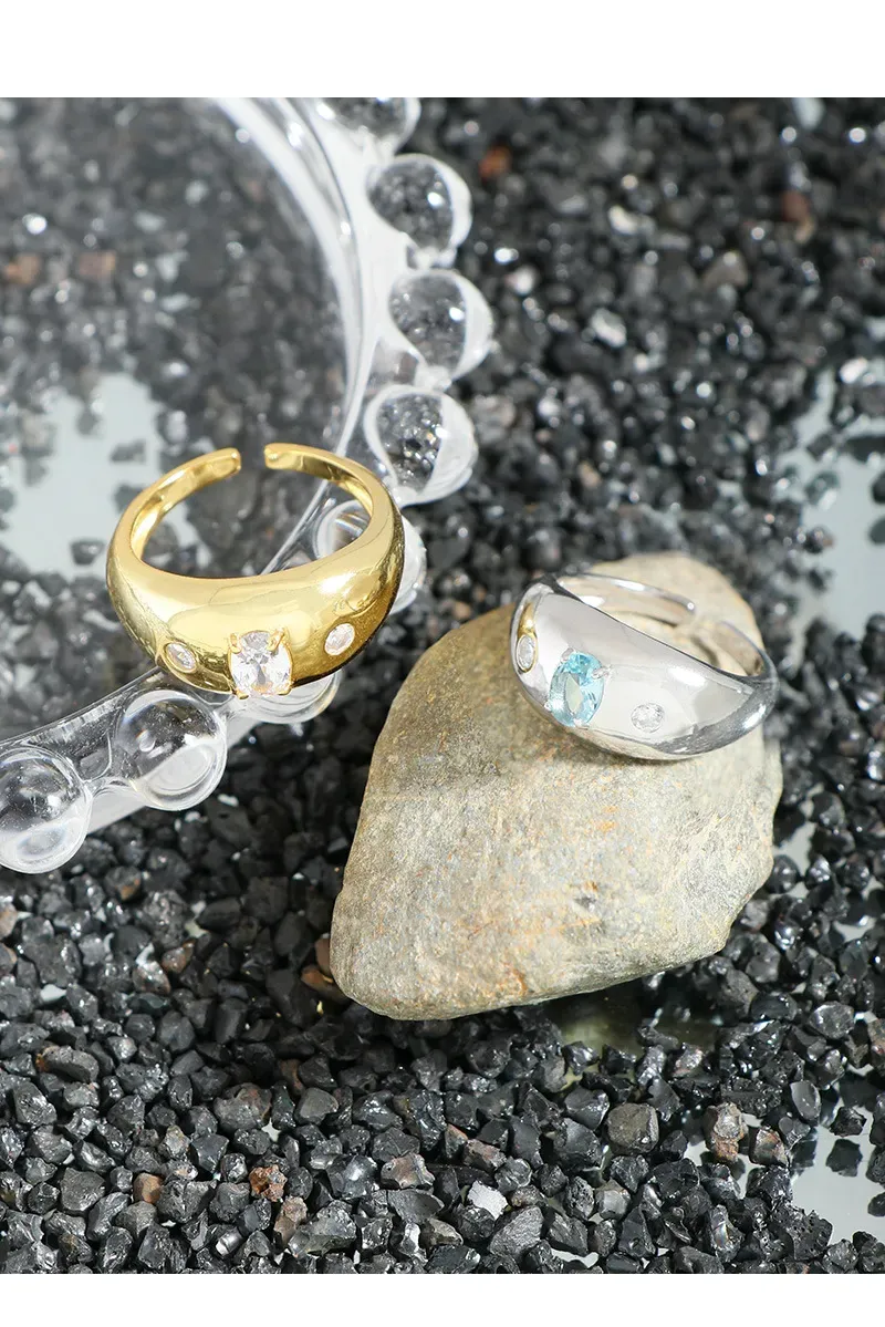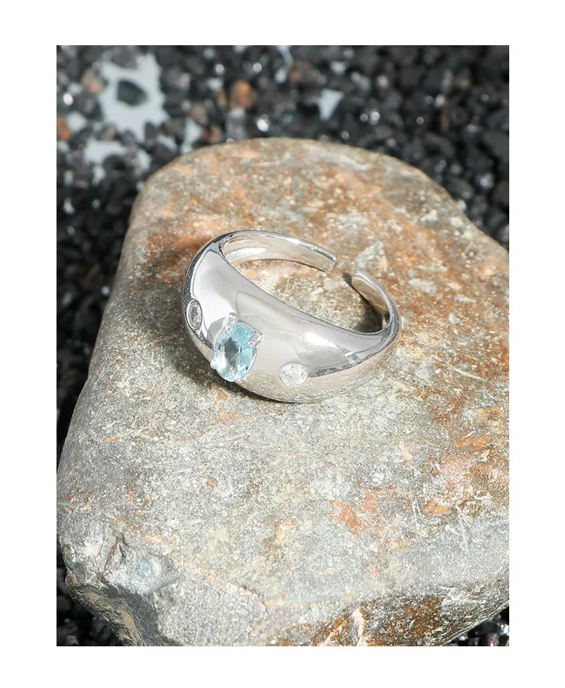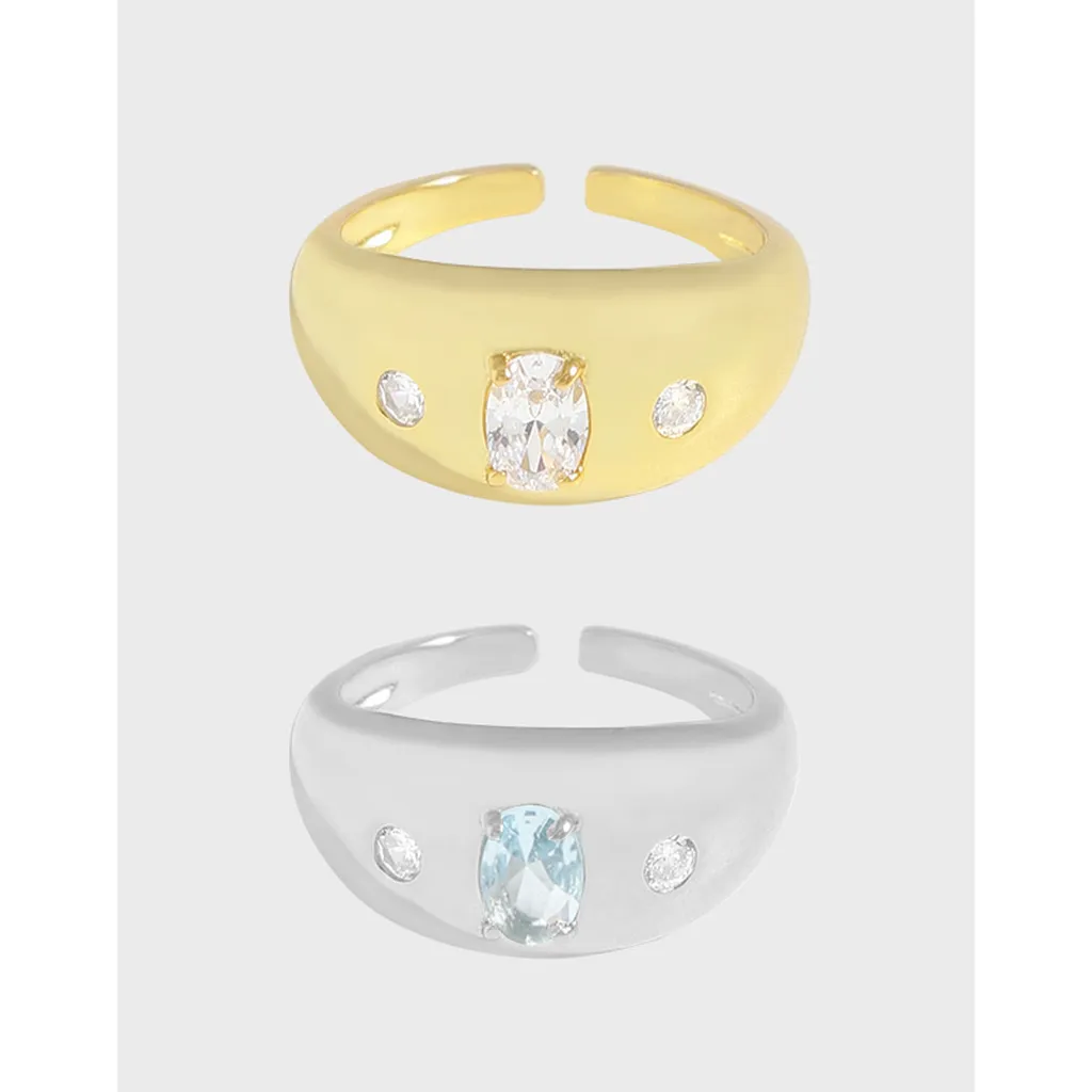 • Color: Available in two captivating finishes: a radiant gold-toned setting or an elegant silver-toned setting. Each ring features a brilliant central oval gemstone – either a clear crystal, shimmering like a distant star, or a serene aquamarine blue, evoking the depths of a pristine sky. This is gracefully flanked by two smaller, sparkling clear accent stones, completing the celestial hue palette.