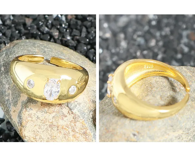• Patterns or Textures: The polished metal band boasts a smooth, reflective surface that captures and plays with light. The gemstones are seamlessly set into the metal, creating an organic integration that highlights their natural sparkle. The arrangement of the oval central stone and two round accent stones forms a subtle, celestial pattern, with each facet catching the light to create a delicate dance of shimmer, mirroring the beauty of the night sky.