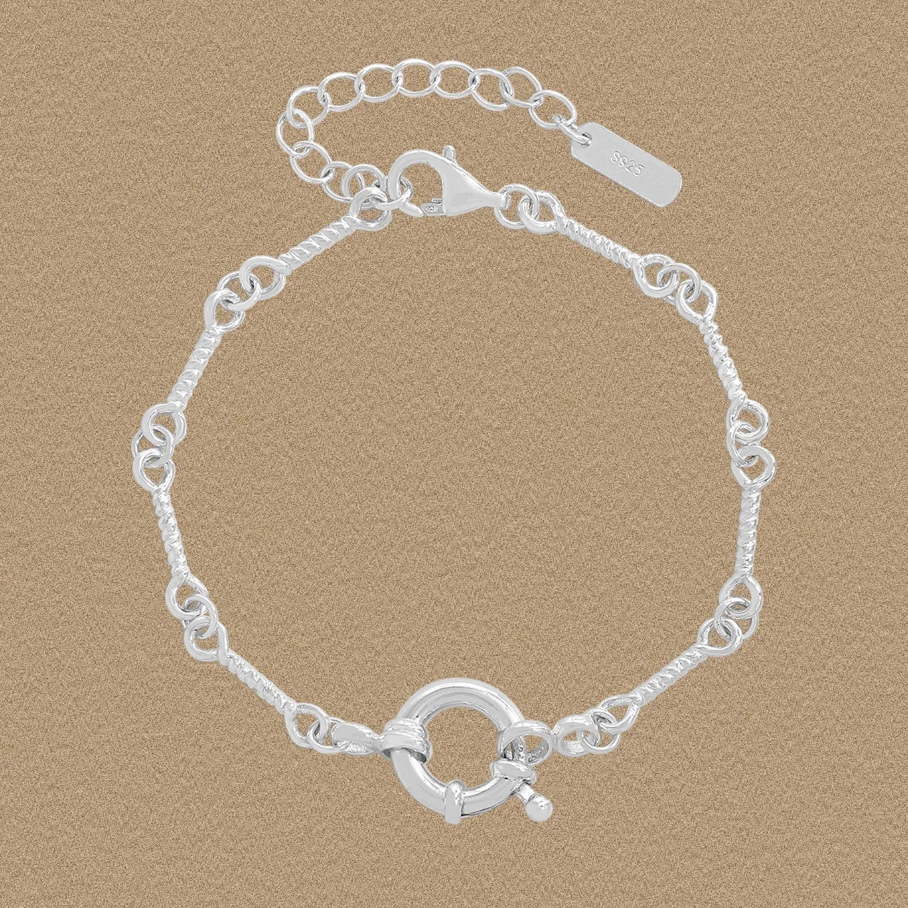 The bracelet’s unique charm lies in its intricate patterns and raw textures. The main chain artfully alternates between highly polished, smooth O-ring links and segments of delicately twisted silver wire. This dynamic interplay creates an ‘imperfect beauty’ reminiscent of natural elements and patterns, celebrating the subtle, tactile artistry of the earth. The textured sections beautifully contrast with the smooth elements, capturing the ever-changing brilliance and dynamic nature of light.